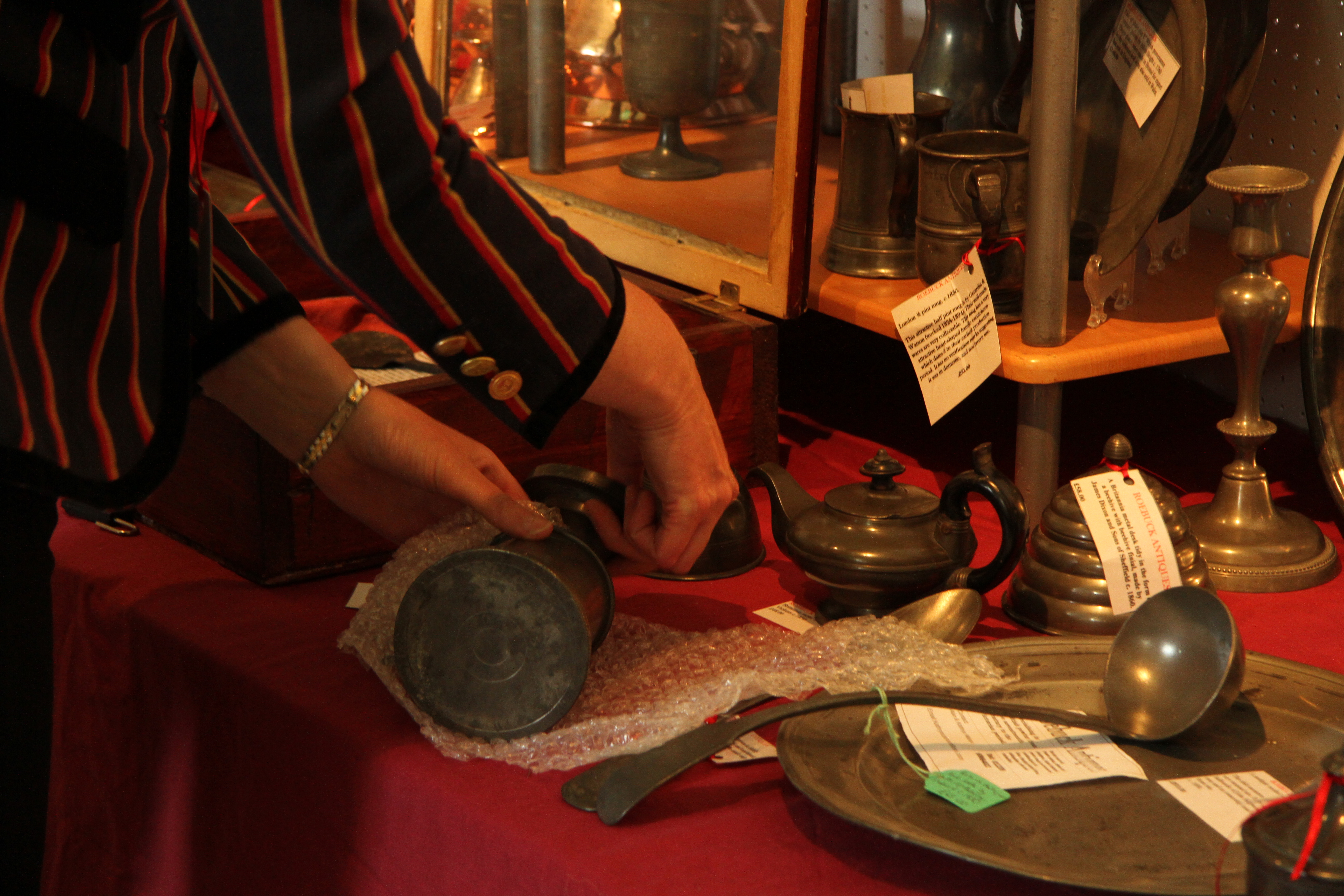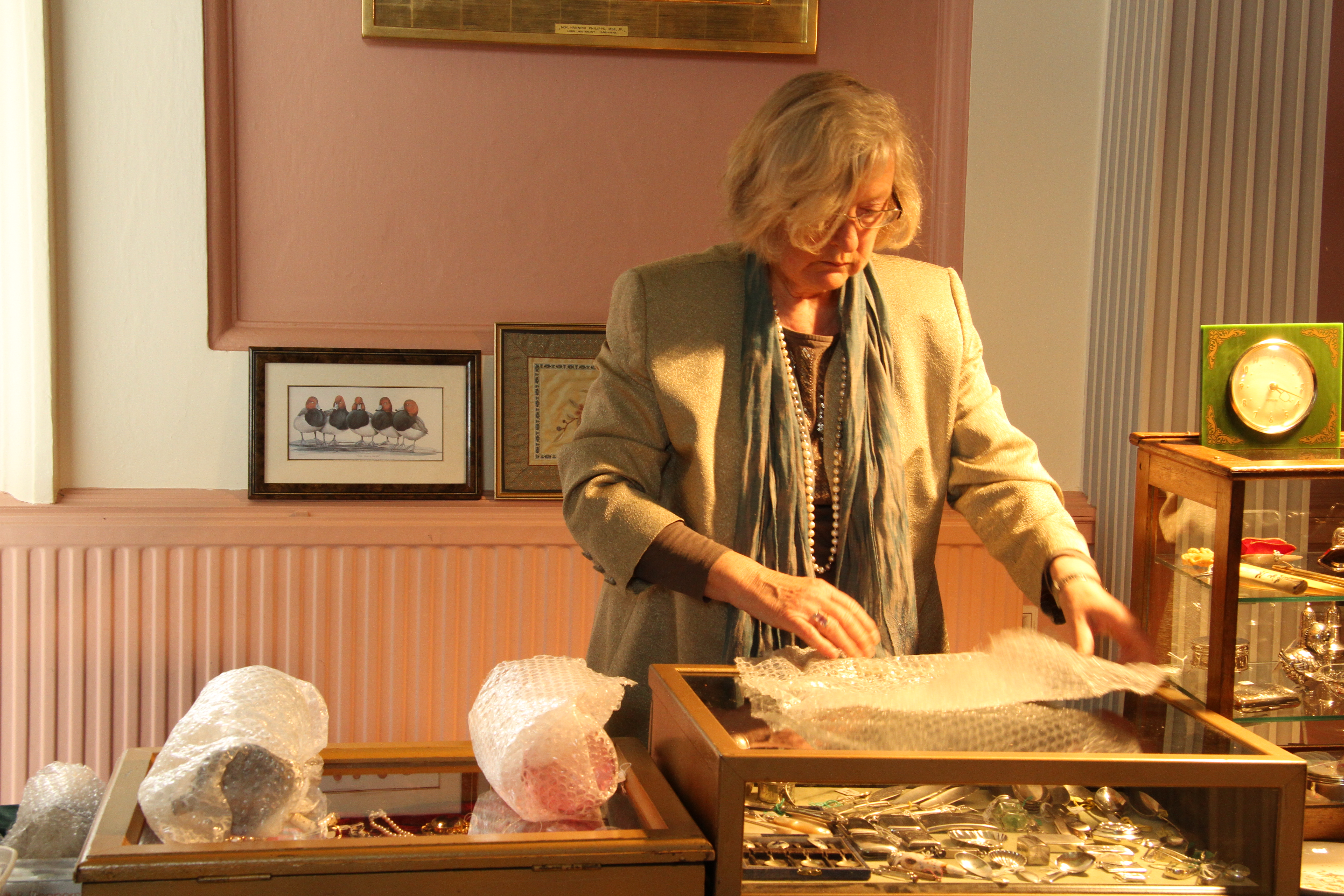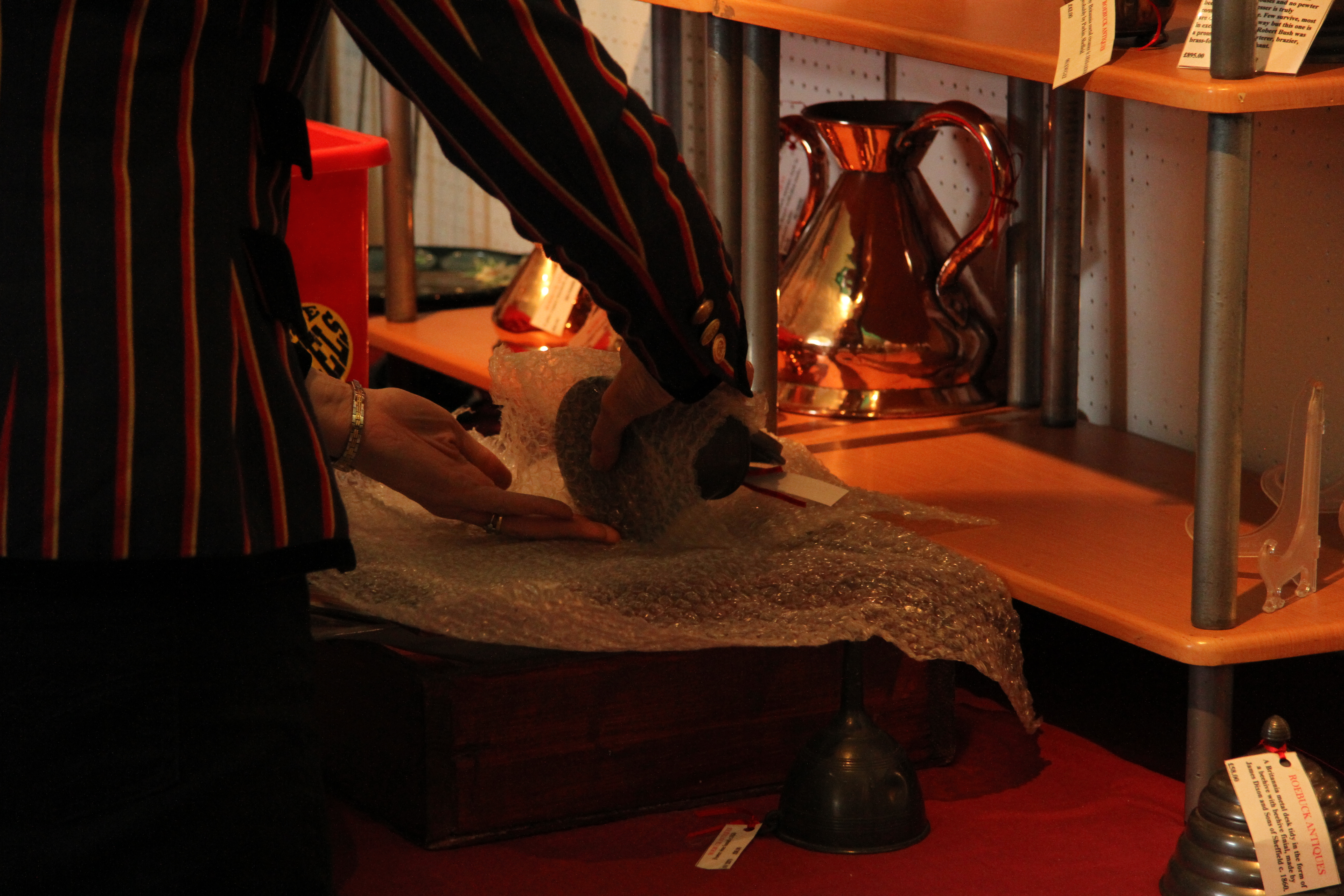 The dealer’s partner stepped in to prepare for  packing away some of the smaller items.