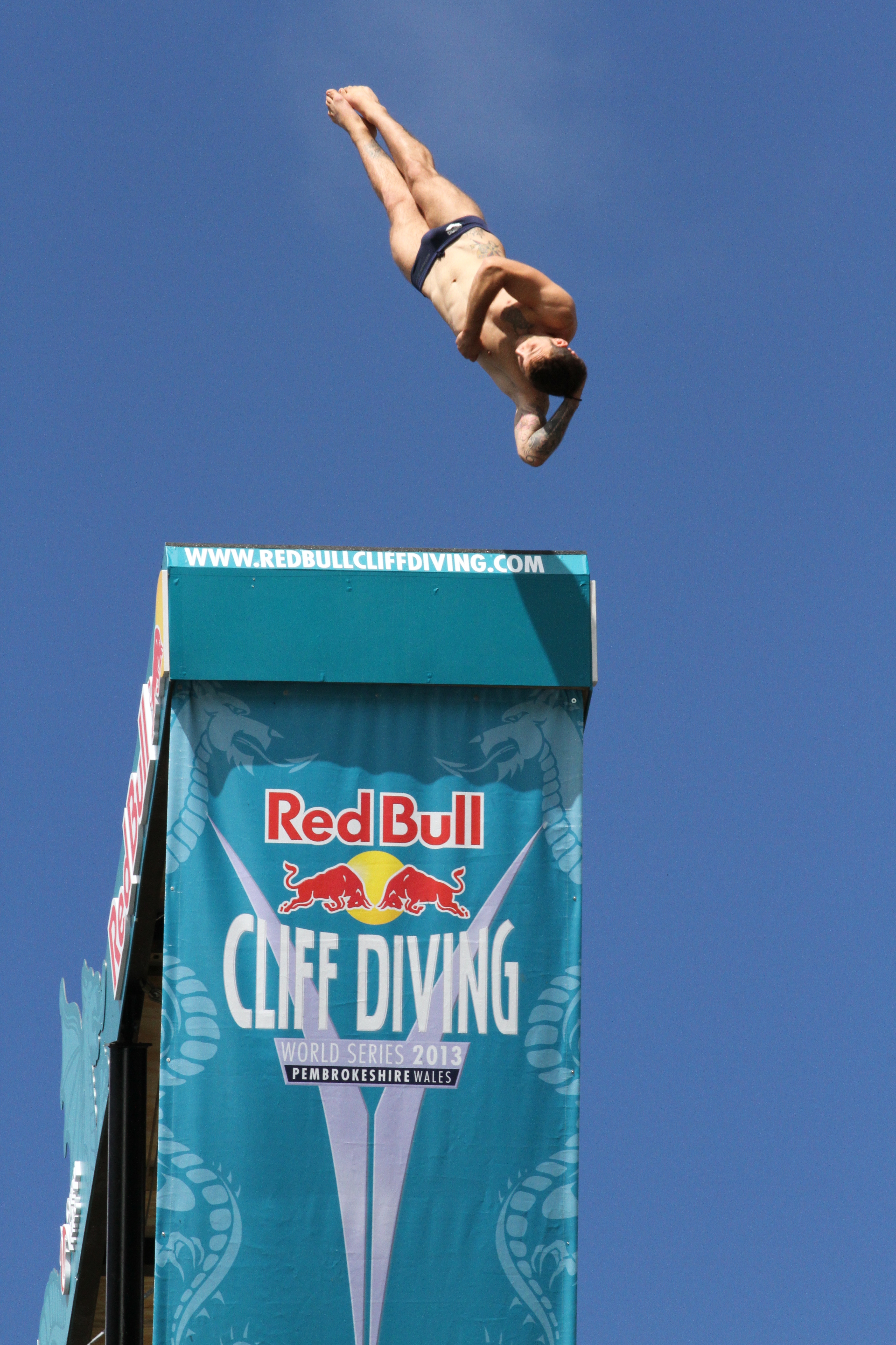 Taken at the Red Bull Cliff Diving Championships when they were held last year at Abereiddi in North Pembrokeshire, these two photographs were shot from a kayak in the water below the 40 metre high cliff top diving board. I used my 100 – 400 mm telephoto zoom lens in order to get close in to the distant subjects and a high ISO setting with fast shutter speed to freeze the action. There are a number of contrasts identifiable within these two images as well as the obvious ones of High and Low. The diver is clearly demonstrating action and tenseness whereas the observer in the boat at the foot of the cliff is clearly inactive and relaxed. The diver and the diving platform are towards the vertical plane, whereas the boat and the observer are clearly horizontal. The image of the diver is stark and uncomplicated and it is clear what is going on whereas the image of the observer has a number of additional elements which provide clutter and complication such as the presence of the third hand, the mystery object on the left of the frame and the beer bottle which raise questions. Is the watcher asleep or not?!