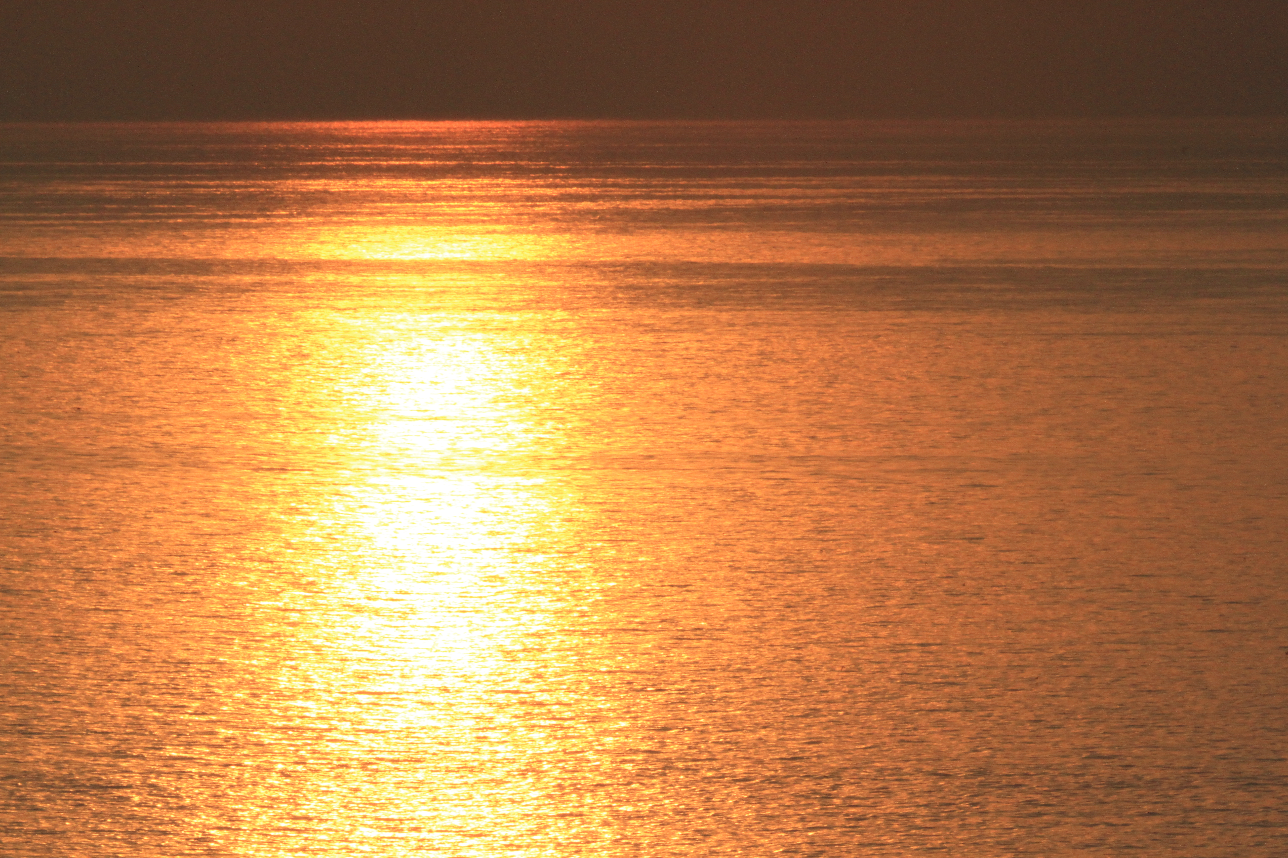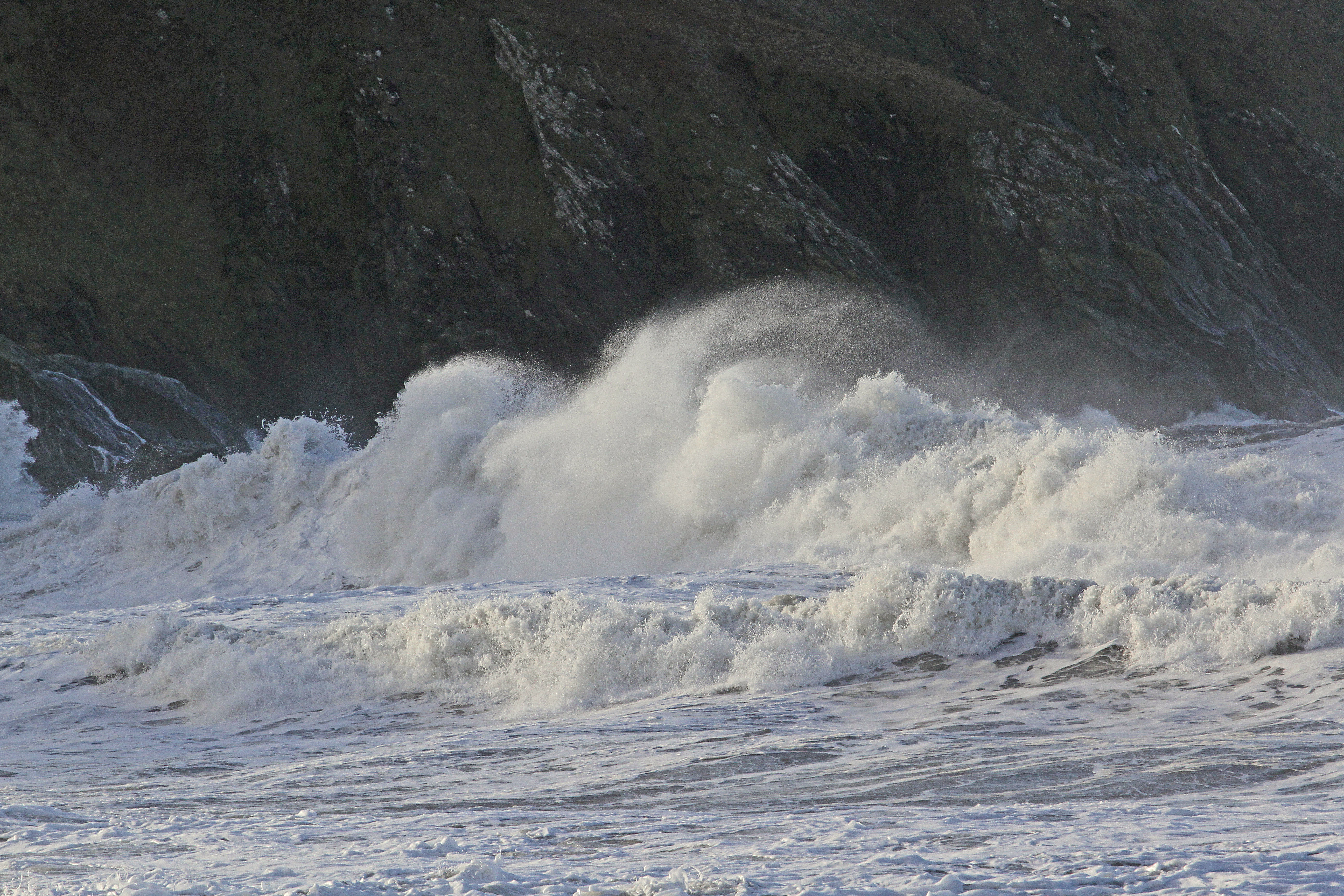 The shot of storm breakers at Abereiddi, North Pembrokeshire, demonstrates the power and energy of water when the forces of wind and tide are at work on it. Even the solid rock cliffs in time will be worn down by the power and movement. In contrast, that same water can take on a different character entirely as shown by the shot of peaceful evening light shining gold on a calm sea in the same area on a different day. Another obvious contrast between the two is the cold grey light of the storm scene and the warm golden light of the evening shot.