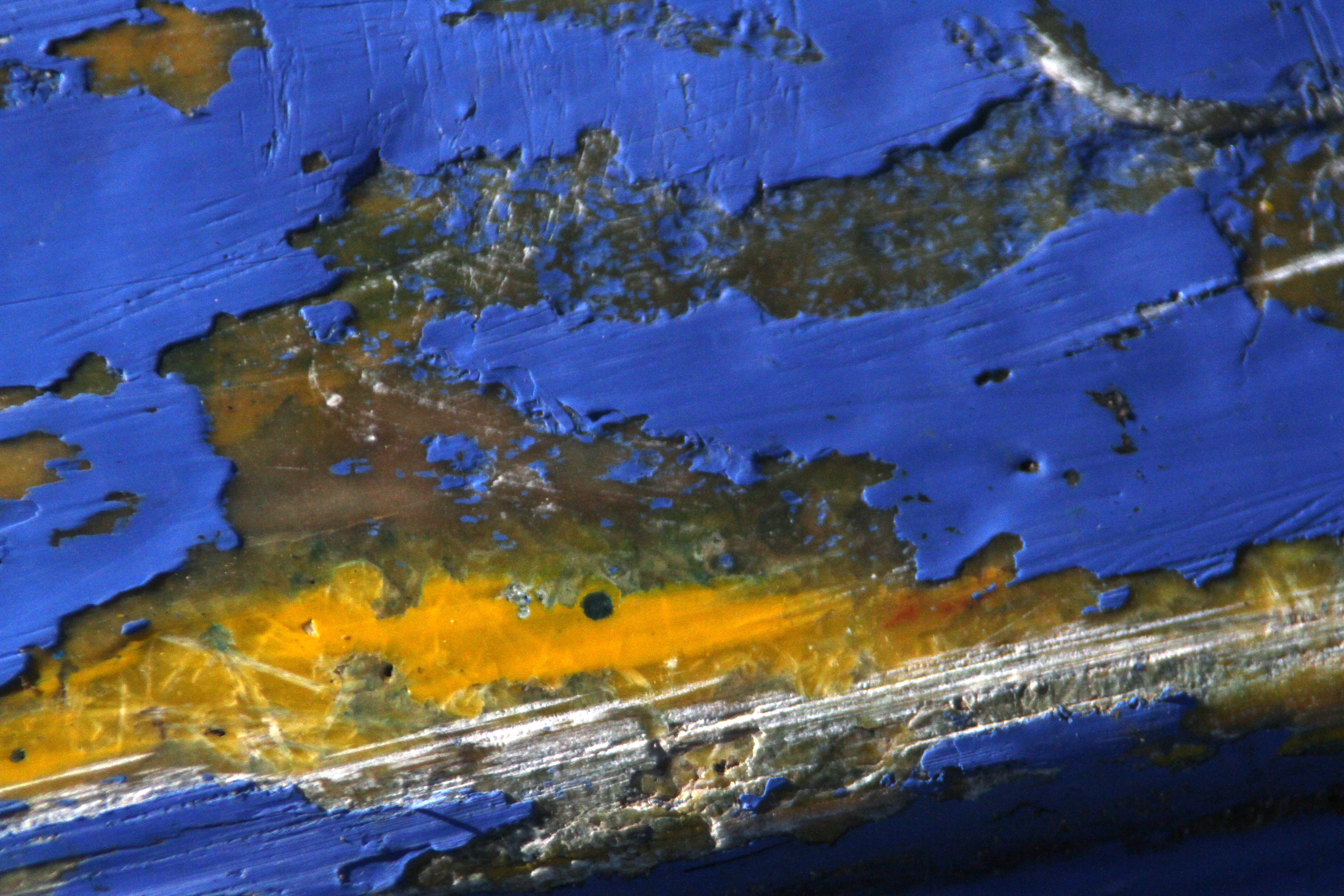 Coloured garden lights seen through a glass bathroom window provide an interesting and attractive transparent image, which has a translucency , brightness and freshness. By contrast, the second image of a boat hull’s old and weathered painted surface, although having a similar blue and gold palette, is dull and lacklustre and does not have the vibrancy and luminosity of the transparent subject with the back lighting.