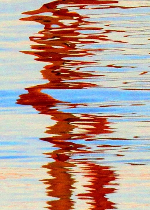 The reflection of a large metal structure on rippling sea water creates a wonderful fluid image reminiscent of an abstract watercolour. This provides a striking contrast with the sun dried, cracked bed of a large former puddle where the previously liquid mud has dried in the sun and solidified into a crust. I have chosen this latter image because it not only provides a contrast with the liquid image, but also because it contains an internal contrast of its own. The hard, dry, brown and brittle nature of the mud crust is in direct contrast with the soft, resilient, green and fluid filled leaves of the grass.