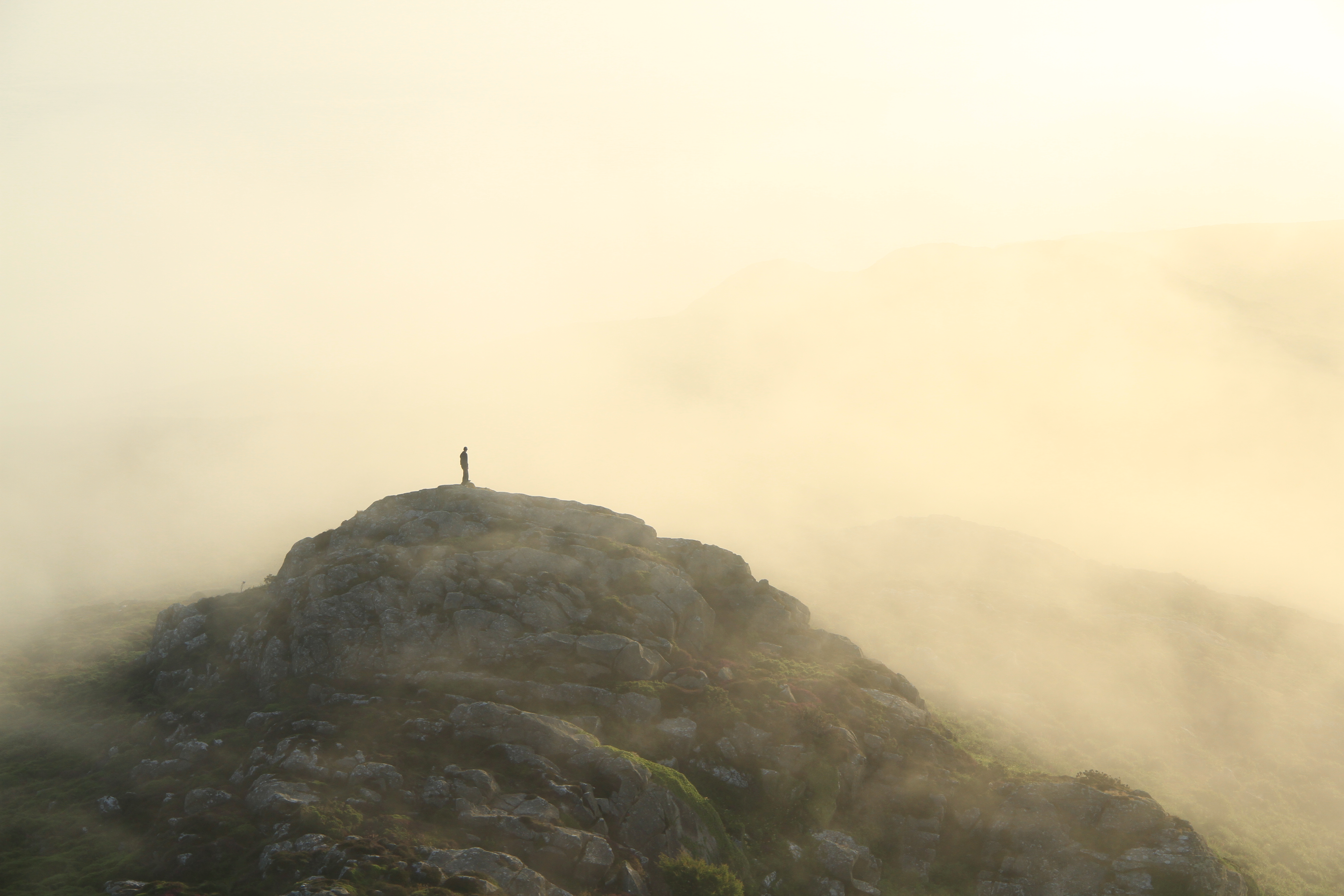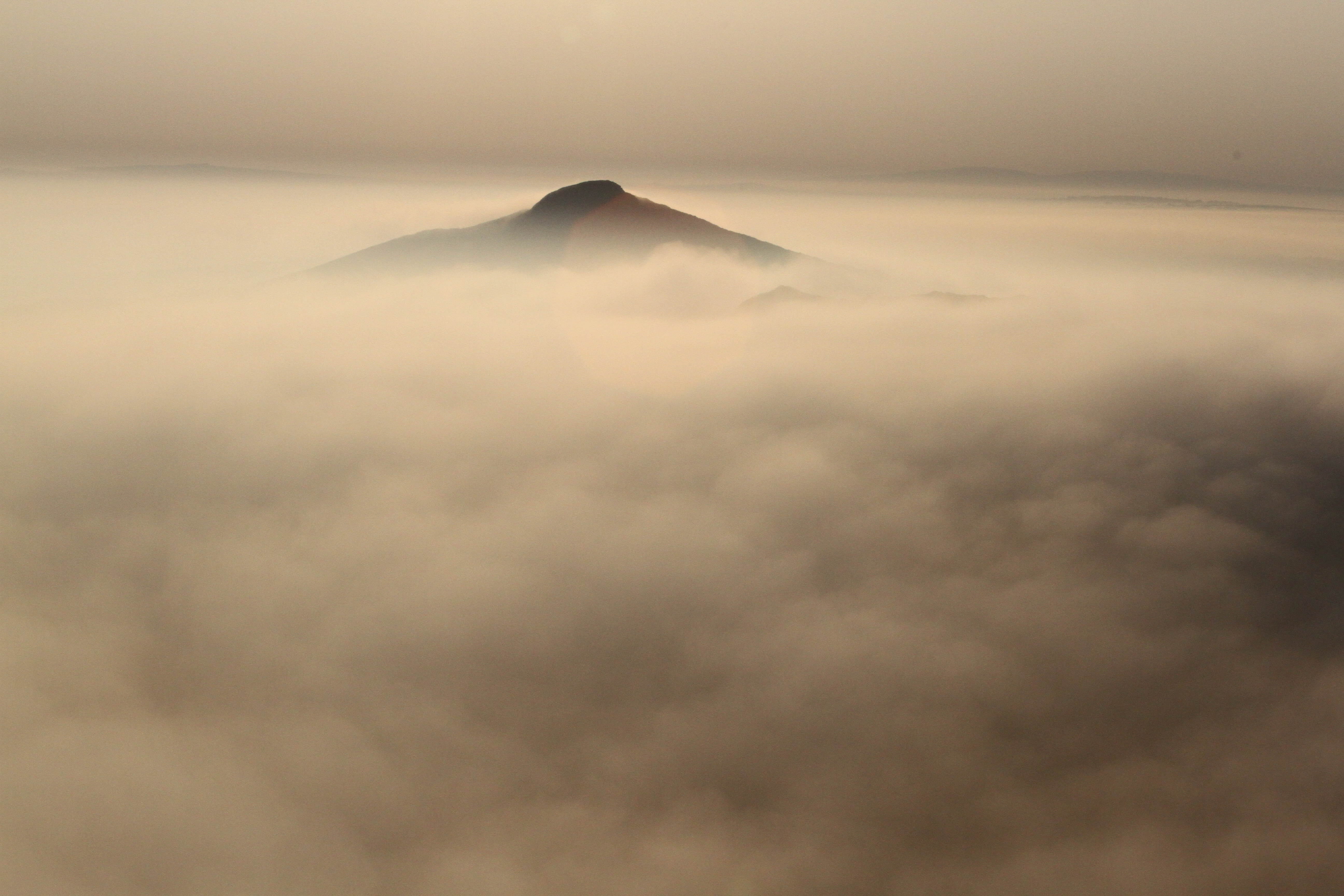 This shot taken with a 70-200 telephoto zoom lens of a peak breaking through the early morning mist in the Preseli Hills, Pembrokeshire, demonstrates a number of contrasts within the one image. Most obvious is the contrast between the light, soft textured clouds and the dark starkness of the hill top and the rounded fluffiness of the clouds also contrasts with the angular solidity of the rock. There is also a contrast between the small size of the visible area of the mountain when compared to the large expanse of the cloud cover giving the impression of the mountain as being an isolated island in an endless sea. The fact that the shot does not contain any other land or subject matter and the cloud blanket extends to the horizon heightens this sense of isolation.