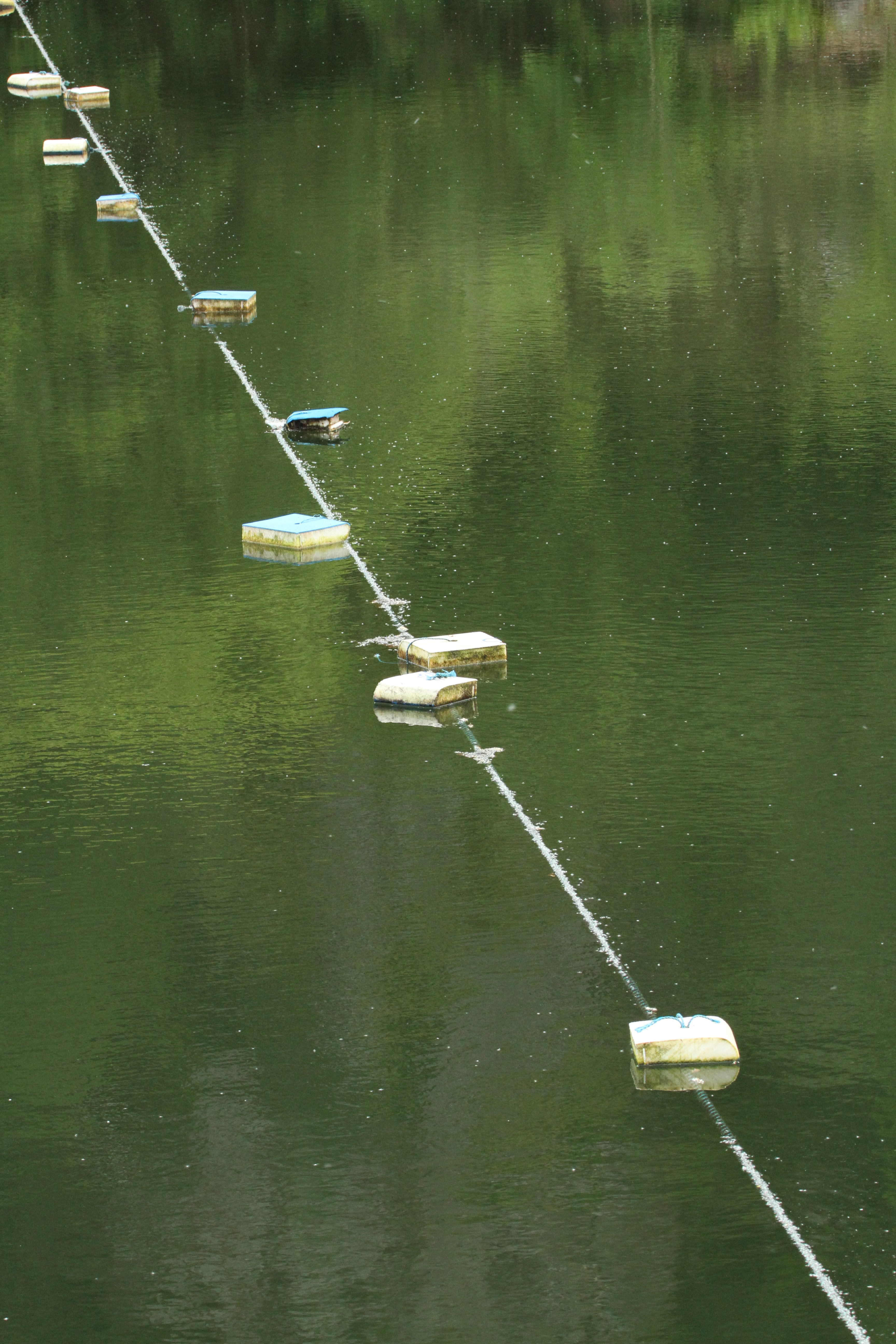 The old oil drums used as a decorative garden divider in a show garden at the Hamden Court Flower Show immediately caught my eye as being an attractive example of a round subject. However, I found that the partial side view rather than the full face view provided a better image as it showed more of the drums and their colour and less of the complex and distracting background. As a contrast I was drawn to the straight line of this stretched rope with attached floats which forms a division line for partitioning off an area for diving and kayaking across a flooded quarry near Haverforwest . The contrast between the two images is more than the obvious one of curve against straight line. The circles / ellipses of the drums provide a sense of fullness and internal space within the structures whereas the tense, tautness and minimal volume of the stretched rope makes for a very different feel to the second image. Interestingly, the straight lines of the shelves which hold the drums provide a contrast to the round drums.