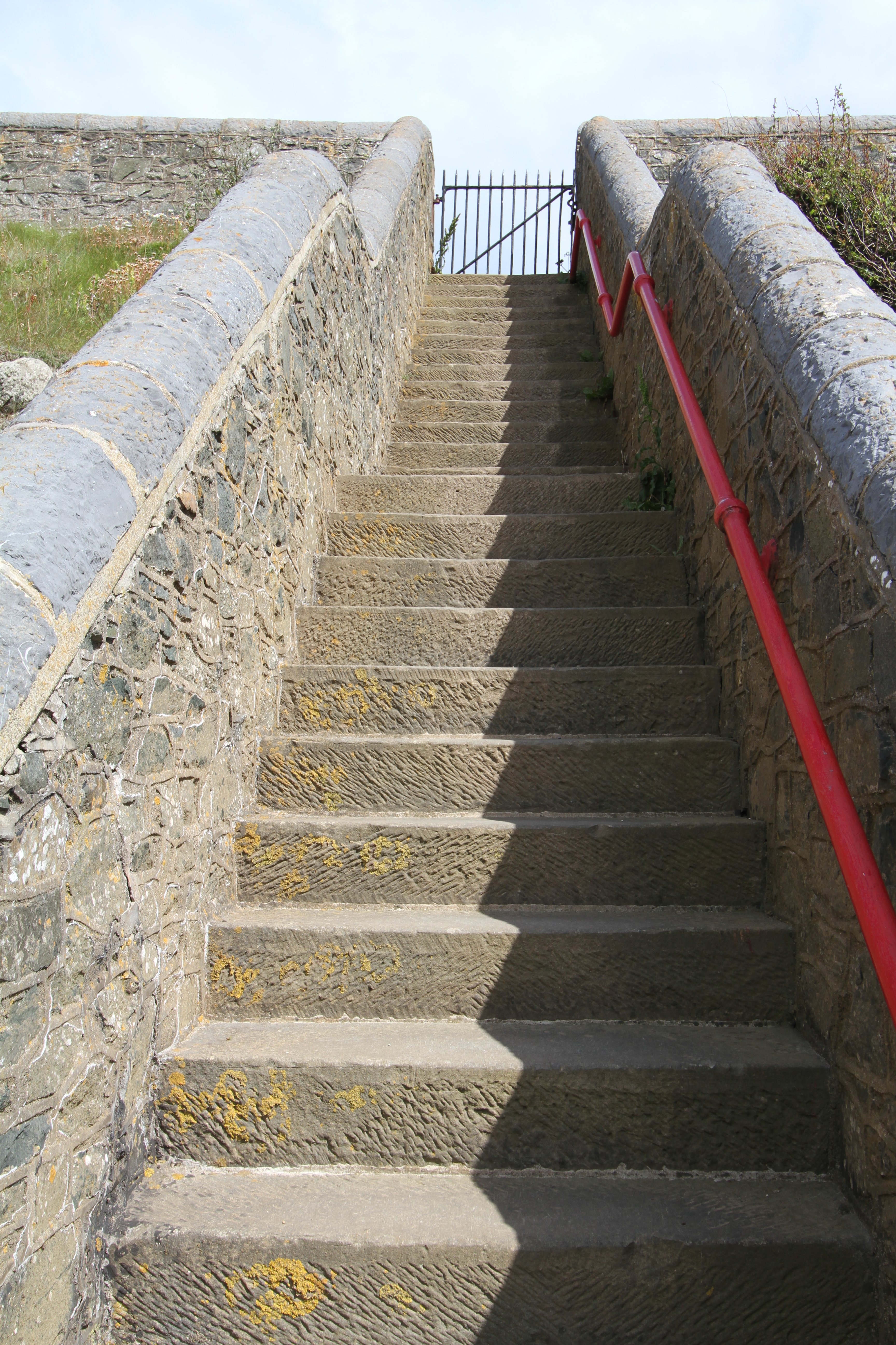 When viewed in terms of lines, both overt and implied, within this shot of a stone staircase at Strumble Head, there is a lot going on as there are horizontal, vertical and diagonal lines involved. The central vertical line created by the interface between shadow and sunlight running up the centre of the staircase is itself composed of short diagonal lines. The staircase itself also appears to be a vertical line from this particular angle of view but with diagonal sides to form a long rhomboid shape. The red hand rail and the tops of the surrounding walls also provide obvious diagonal lines whereas the treads of the staircase introduce a flight of horizontal lines. The tops of the walls on the skyline also provide a horizontal line, the continuation of which is implied across the gap at the head of the staircase. The austerity of the image is reduced and the interest enhanced by the zigzag line of shadow running up the centre and the contrast between the sunlight on the left of the image and the darker shadow on the right.
