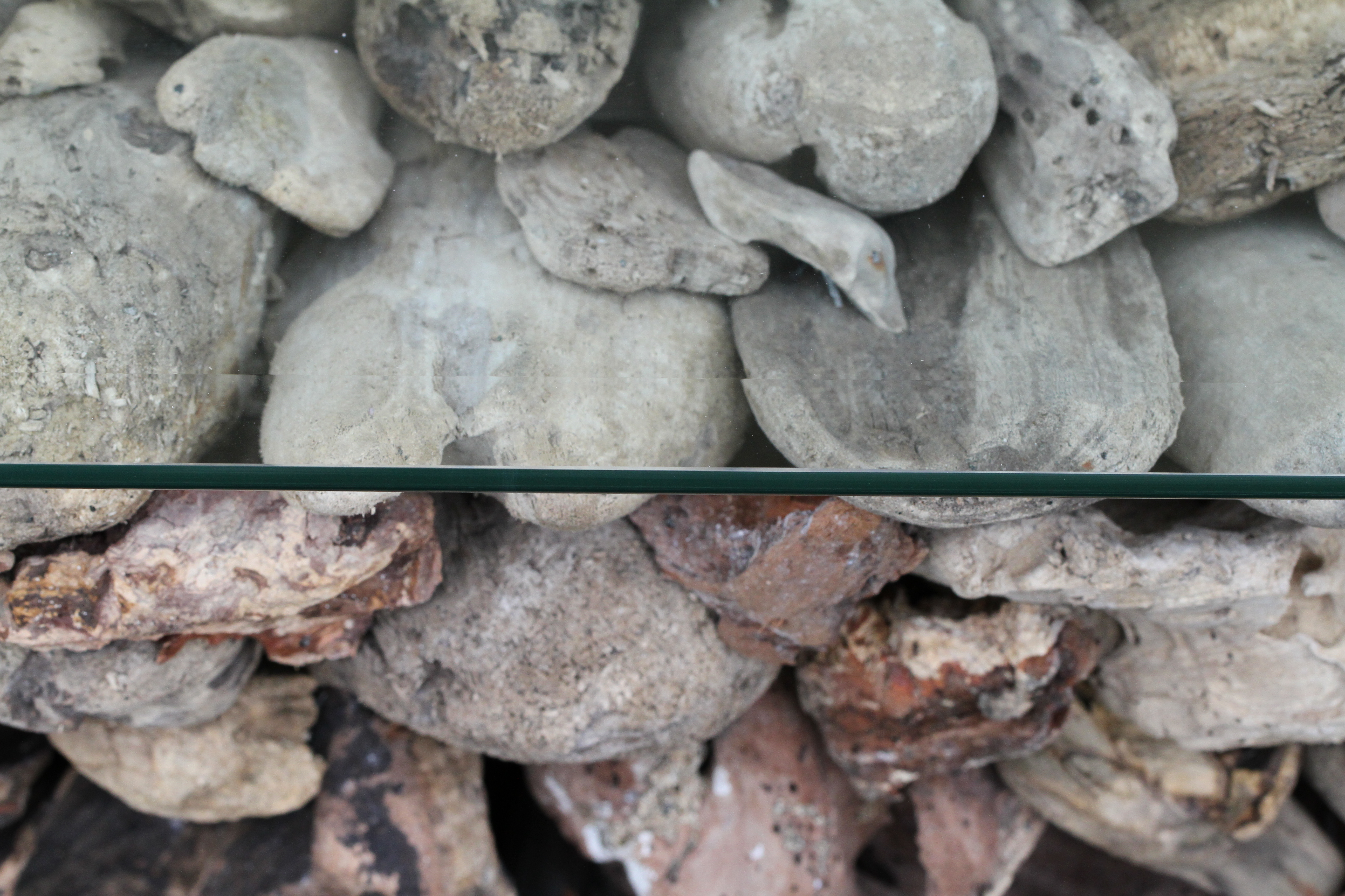 I spotted this table in a local shop and was taken by its unusual construction and the way the colours of the stones which formed the base were changed when viewed through the glass top. It seemed to me that it created an image that was surprising and that could not be identified at once, thereby raising interest and questions. Rather than placing the horizontal edge of the top nearer to one of the margins of the frame, I chose to place it just off centre which I felt made for a more dramatic and surprising image. To me, it also worked better just below the centre line rather than just above.