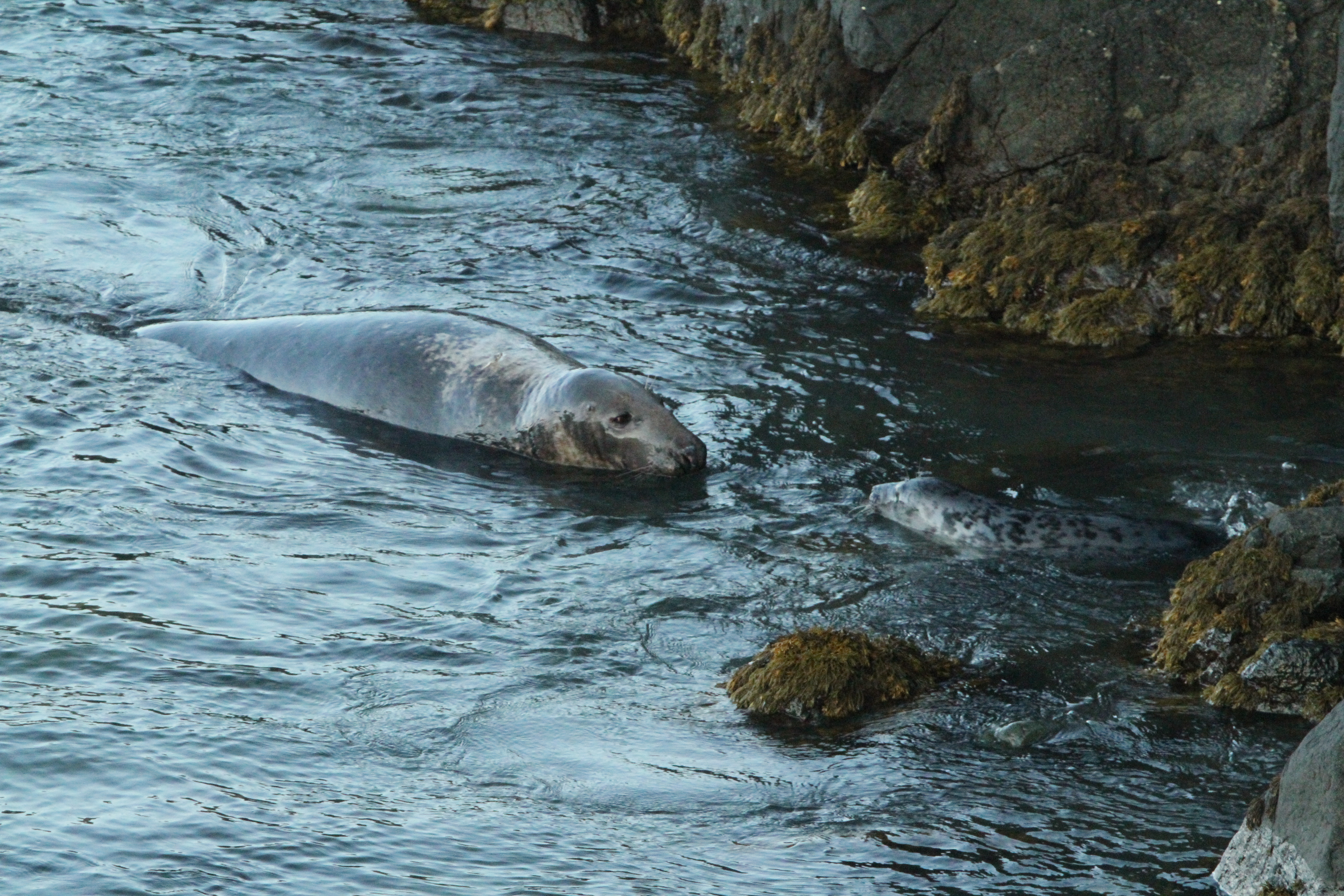 I was photographing seals near the lighthouse at Strumble Head this week when this large, old bull seal turned up and approached one of the cows in shallows by the rocks. It was a scene full of possibilities and I was particularly interested in the powerful focus of the bull on the cow and the considerable difference in size between the two animals. The implied lines of the body of the bull and the edge of the rocks above the seals lead the eye to the smaller cow which would otherwise be almost lost in the image. As a result, both seals are clear subjects within the scene and the disparity in size between the two animals is highlighted.