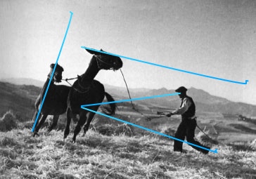 Two images are presented within the course which demonstrate this, namely a bull fight scene and a Sicilian farming scene. These are reproduced below and, using Pixelmator for the first time (!), I have attempted to draw lines onto the image to demonstrate some of the implied lines. My skill does not yet extend to including arrow heads to indicate the ‘line of travel’.