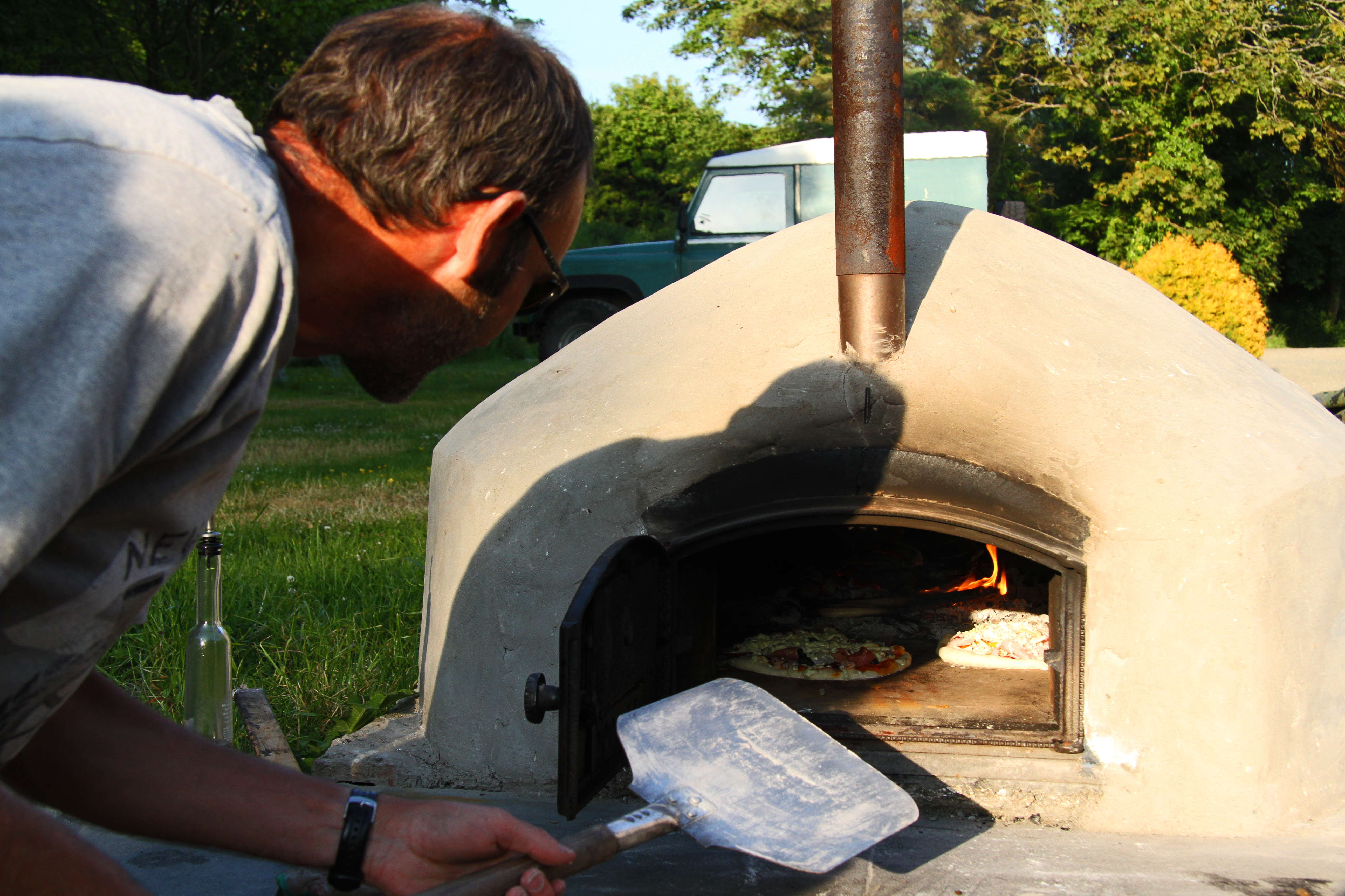 The focus of this image is the pizza within the pizza oven and a number of implied lines draw the eye to this point. The handle and blade of the paddle provide a line leading to the pizza, as does the vertical line of the chimney. The strong shadow line across the face and neck of the subject together with his line of sight also focus attention on the focal point. The frame provided by the open mouth of the oven also draws attention onto the pizza.