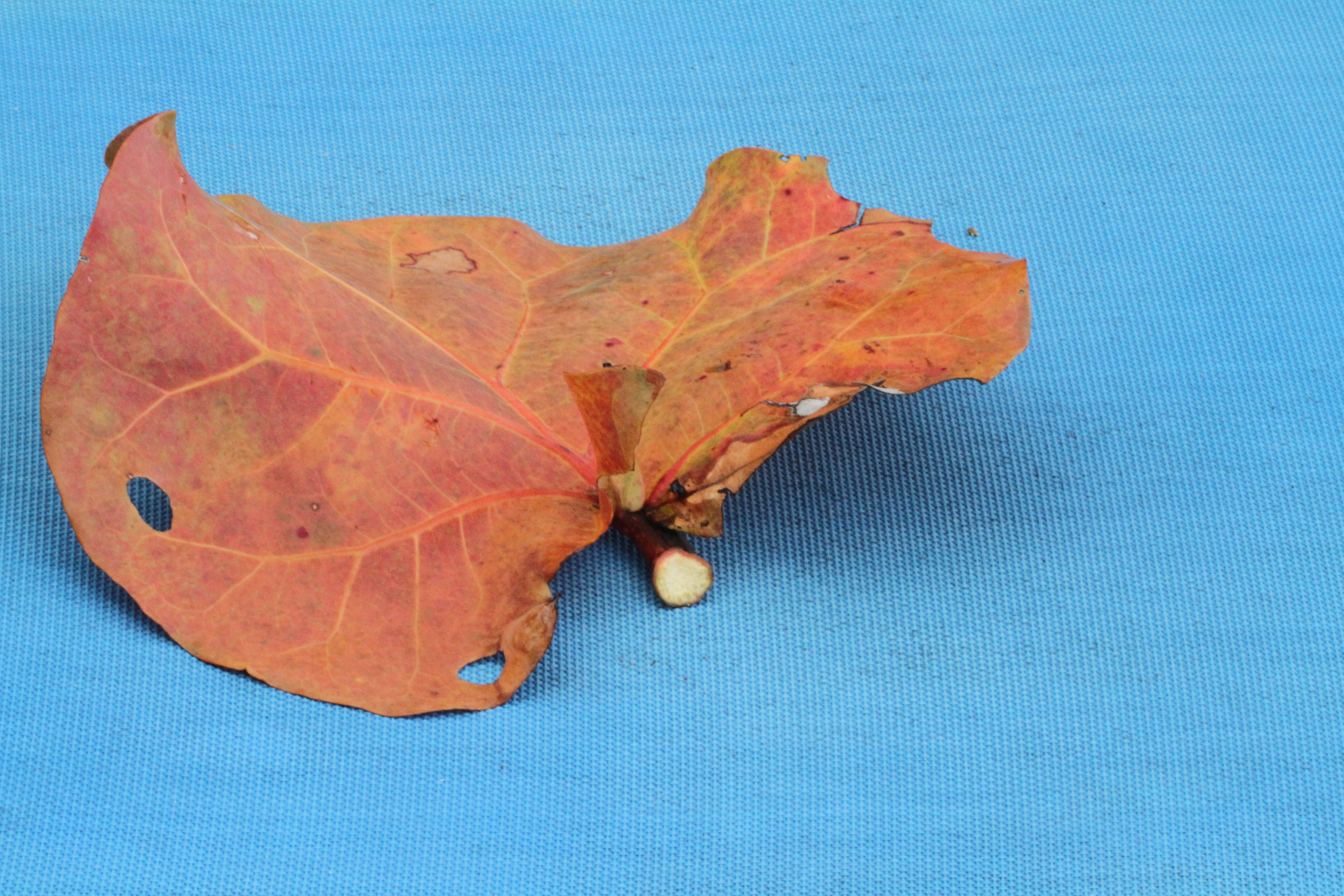 This was an ‘arranged’ shot which was taken in order to make use of natural resources rather than man-made subjects. The colour of the leaf is overall orange but with colour variations within ranging between reds and yellows. The blue background is a pale hue which tends to push forward with the orange, thereby restricting the way that the orange stands out against the background. If the background was a darker blue the orange leaf would tend to stand out more.