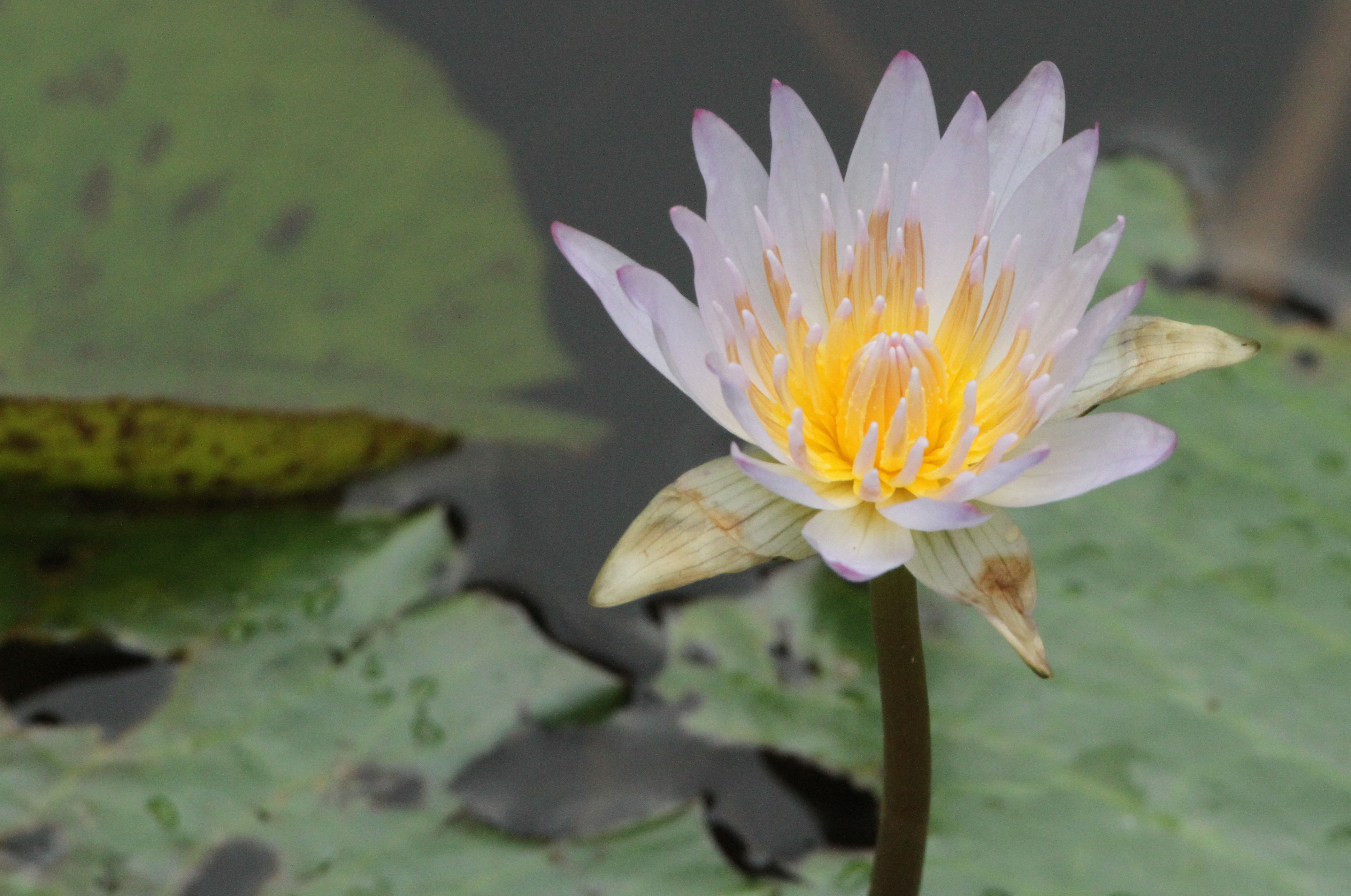 I could not resist the fragile beauty of the lotus flowers on a rather wild pond in the hotel grounds but they were not easily accessible so I had to use a hand held 100 – 400mm telephoto at the upper end of its focal length range to get the shots. Many of the flowers were white with a yellow centre but I was attracted by those with a pale purple hue as this one is as the purple hint seemed to make the yellow sing louder. Owing to the distance, this shot had to be taken in ambient light which was soft and overcast rather than with flash which has probably given a more natural feel to the finished image.