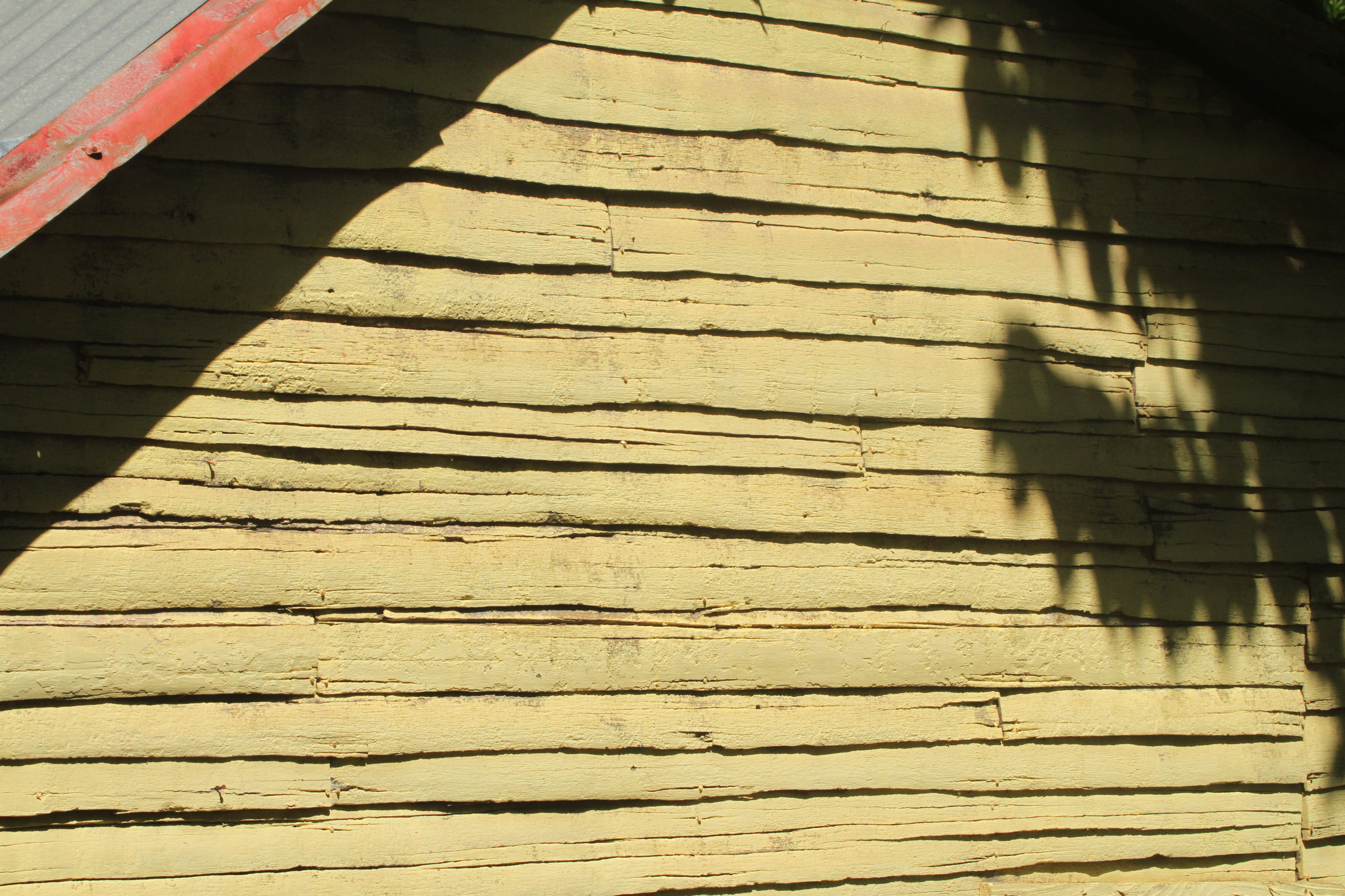 I knew I had to take some shots of this lap timber wall as soon as I saw it, but it was not until I started to explore different angles and framings that I realised what its principle gifts of the subject were. Initially I was attracted by the slight variation in the soft yellow of the fading old paintwork and the dark shadows of the uneven cracks and edges running across the surface. I was then drawn to the patterns of the larger shadows on the surface with the sharp, straight edge of the eaves contrasting with the soft, feathered shadows of the branches on the right. It was not until I had spent some time with the subject that I realised that a particular reason that I was drawn to the subject was the presence of the contrasting red colouration in the tin roof but to include all of it in the image detracted from the effect. It was only by creating an accent in the top corner of the image that I found the effect that I was looking for and that worked for me.