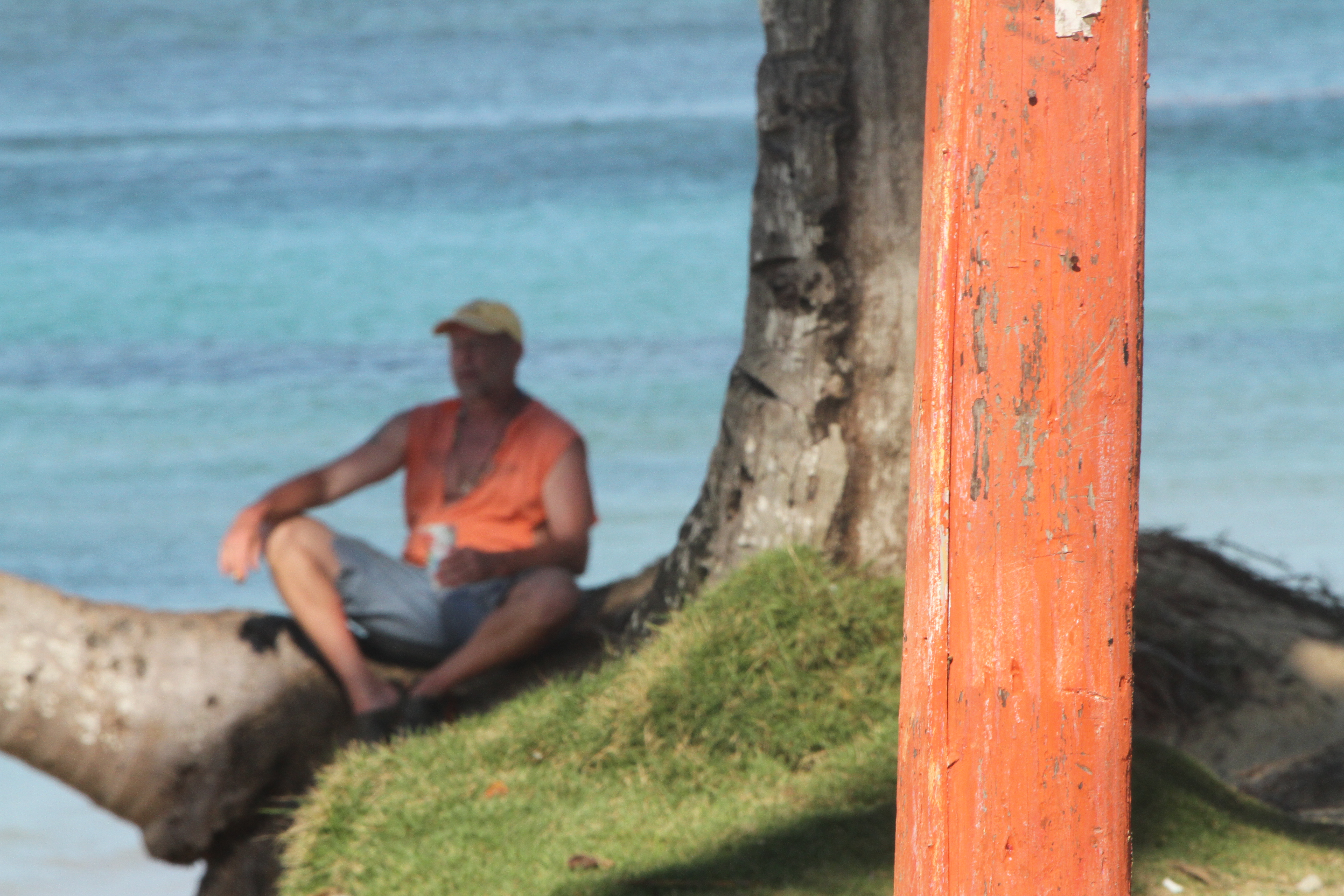 Whilst returning to the hotel along the coast road, my attention was taken by a man sitting by the water underneath a palm tree. It wasn’t so much the subject that caught my eye but the juxtaposition of his orange jacket and the similarly coloured post in the foreground. Trying not to attract his attention, I took a few shots with my 100 – 400mm telephoto lens using different focal lengths to get different framings and this is the one that worked best for me. The image turned out to be something of a compromise between getting an interesting composition whilst also retaining the juxtaposition of the two orange elements that I wanted. The effect of these orange highlights is increased by the fact that all the other colours in the image are in the cool part of the spectrum. The fact that the post is in focus and the figure is not makes the post the principal subject of the image.