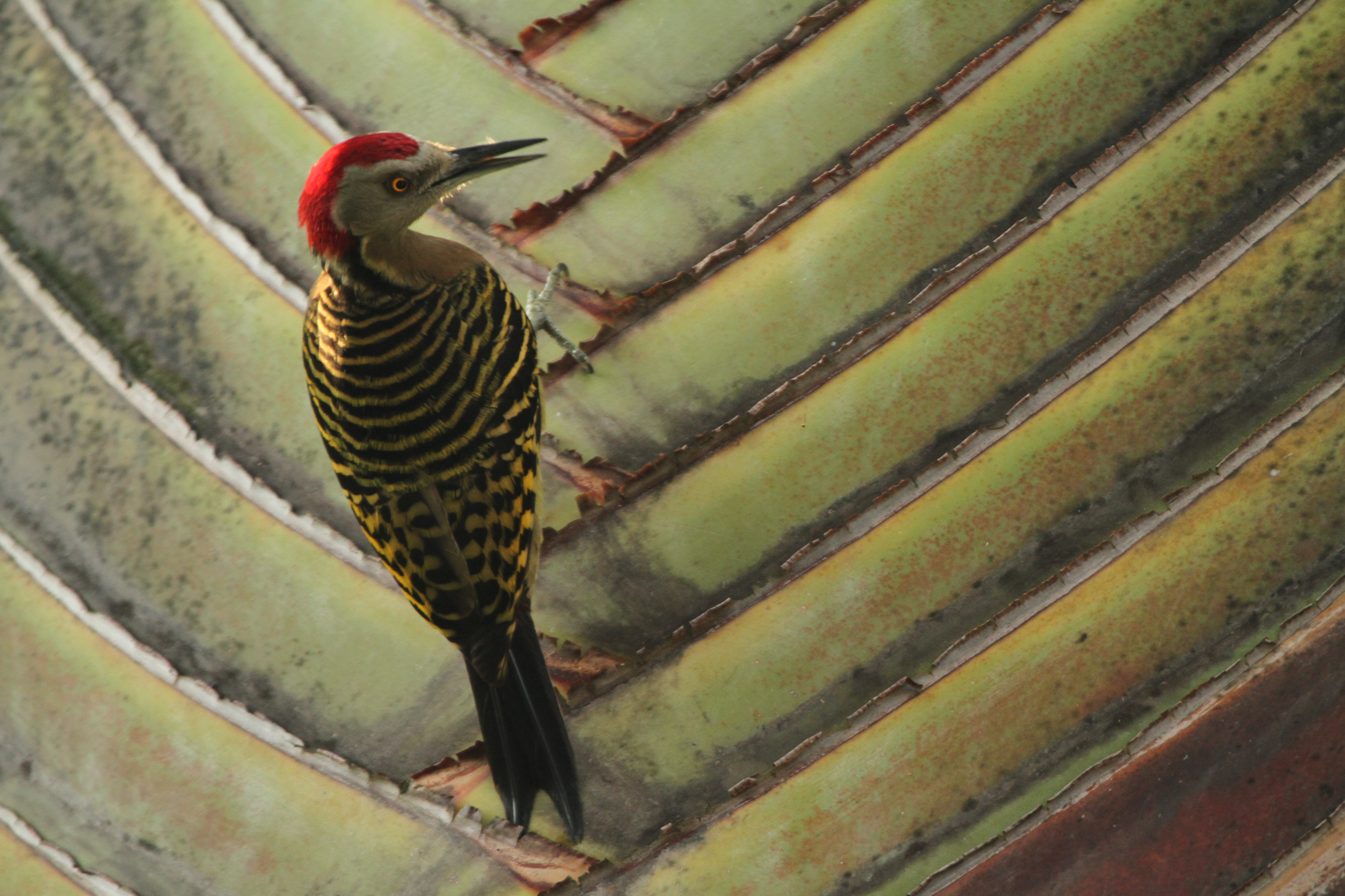 Although this image is not as sharp as it might be due to the fact that that it was taken with a hand held 100 – 400mm telephoto lens toward the upper end of its focal length range, I still like the vibrant effect of the red and white banner against the yellow-green of the banana leaf background. Both colours, the red and the green, work together to add to the composition with neither dominating.
