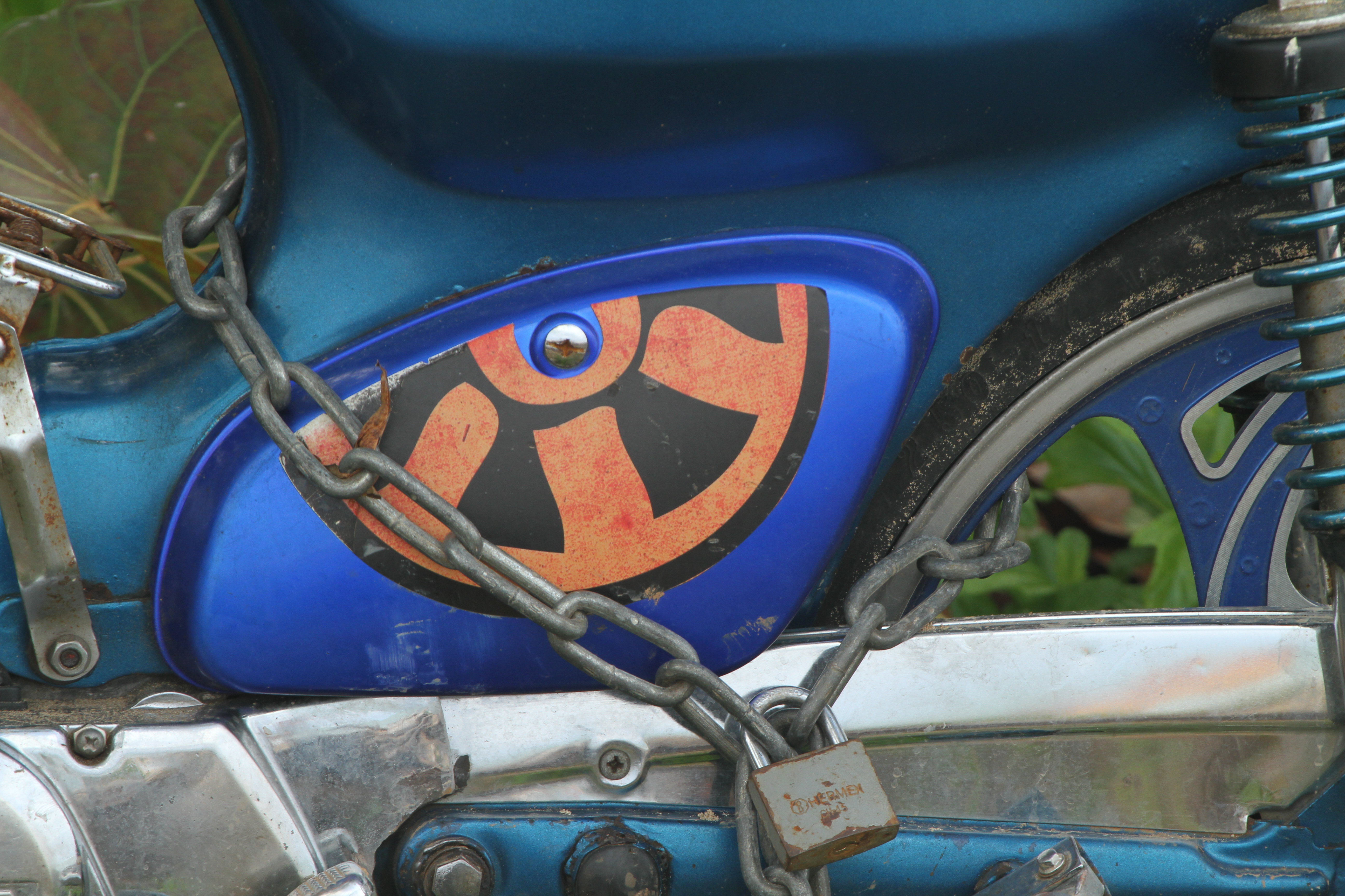 On the lookout for subjects with a mix of orange and blue, I spotted this detail decoration on a motorcycle parked in the town of Las Terenas. The effect of the orange against the blue is interesting as there are at least two different blue hues in the picture, an electric blue which pushes forward with the orange design and the greener shade of blue behind which sits back in the picture. The orange is the only warm colour in the image and this helps it to stand out against the blue and create interest. It is also picked up in the faint highlight reflection to the right of the image which adds interest and keeps the eye moving around the frame.