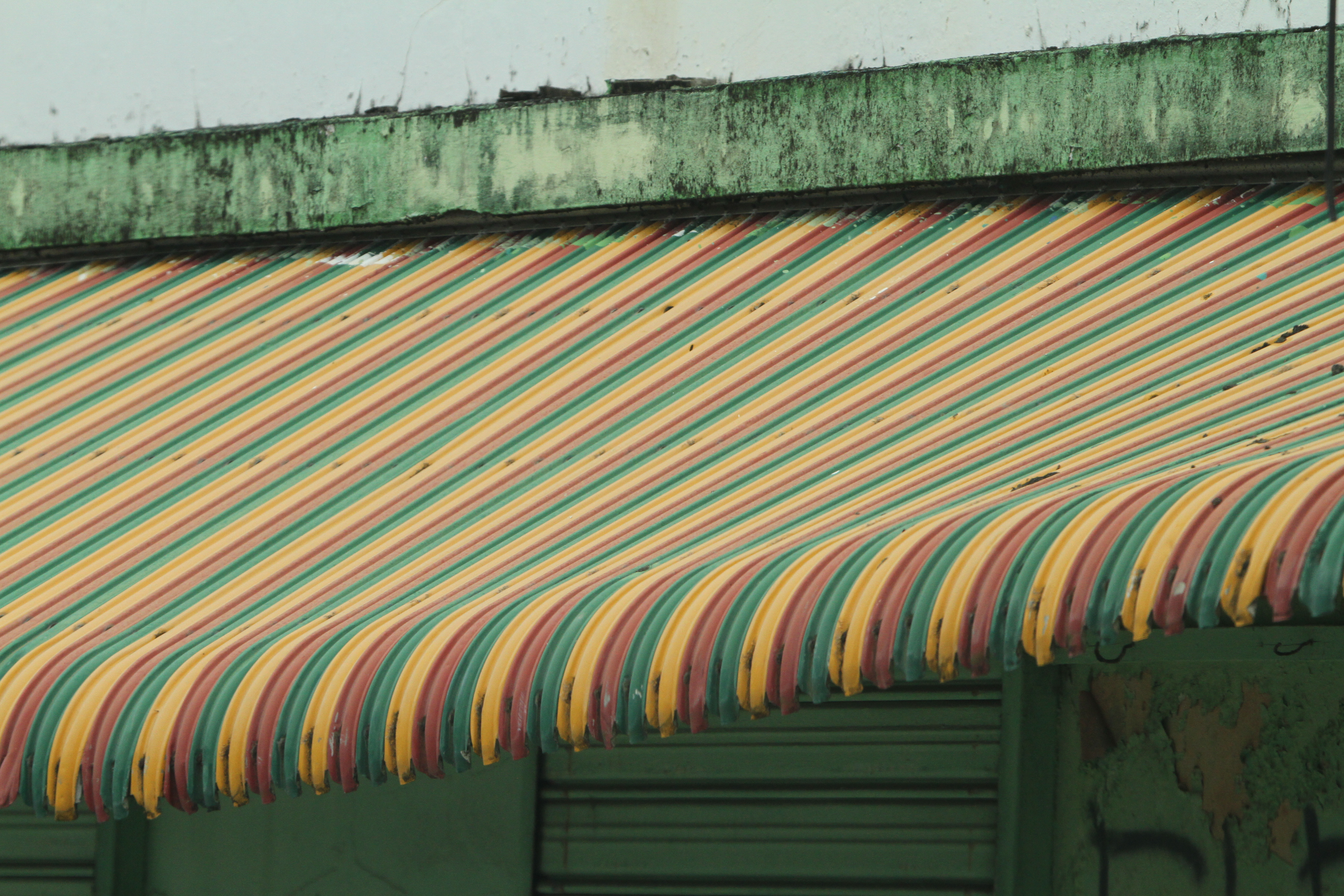 Taken through the window of a bus, this shot was grabbed quickly in a brief moment while waiting at traffic lights. I loved the mix of soft colours, the harmony generated through their proximity on the colour circle and the pattern created by the curves of the roof. The green hues of the framing elements of the image above and below the awning maintain the harmonious and soft colour palette.