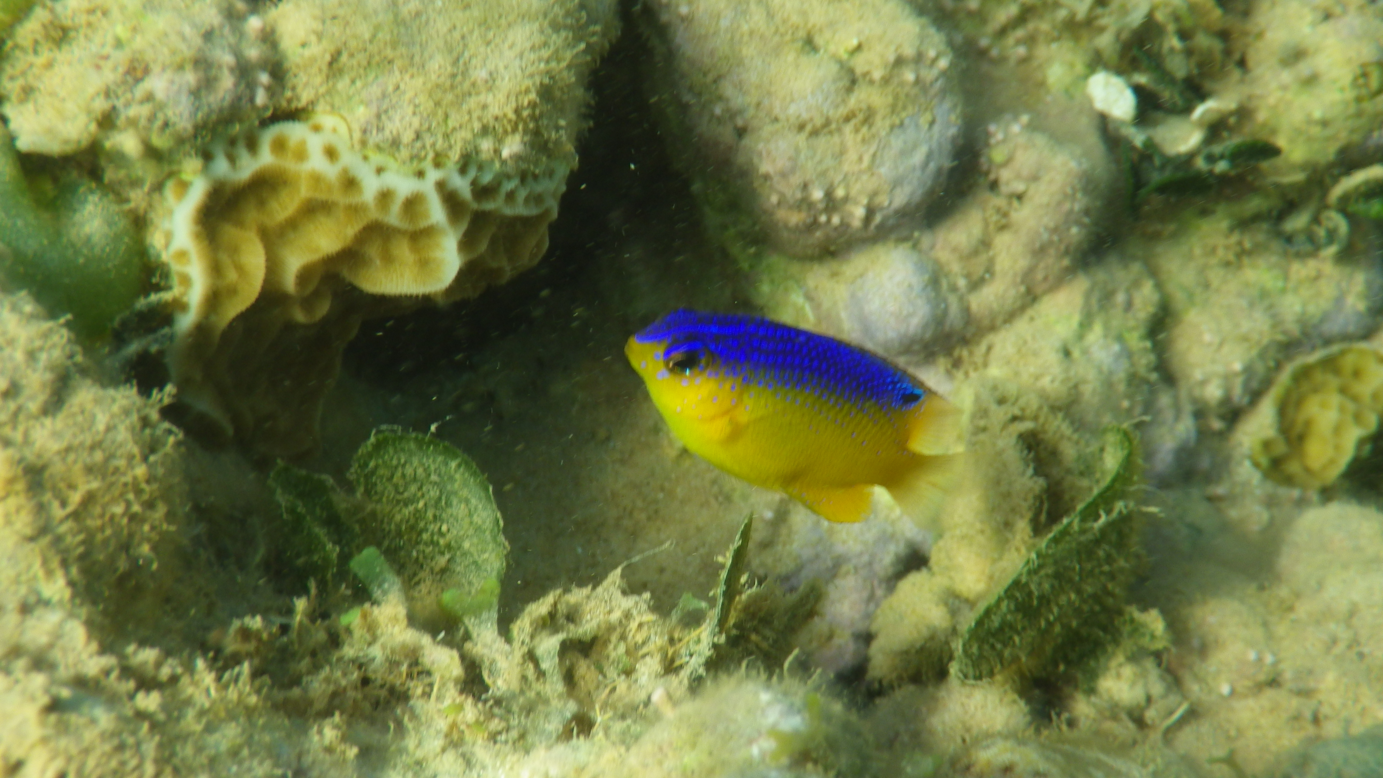 Whilst snorkelling on an inshore reef off the hotel beach I photographed a number of reef fish including this juvenile Beaugregory. I used two underwater cameras, a Pentax Optio WG-II and a JVC GC-XA1 BE action camera and I took both still photographs and video footage. Whilst this image is not of the highest quality, I have included it partly as an example of the underwater work that I did but also as an example of the startling and dramatic effect of having the contrasting primary colours blue and yellow together.