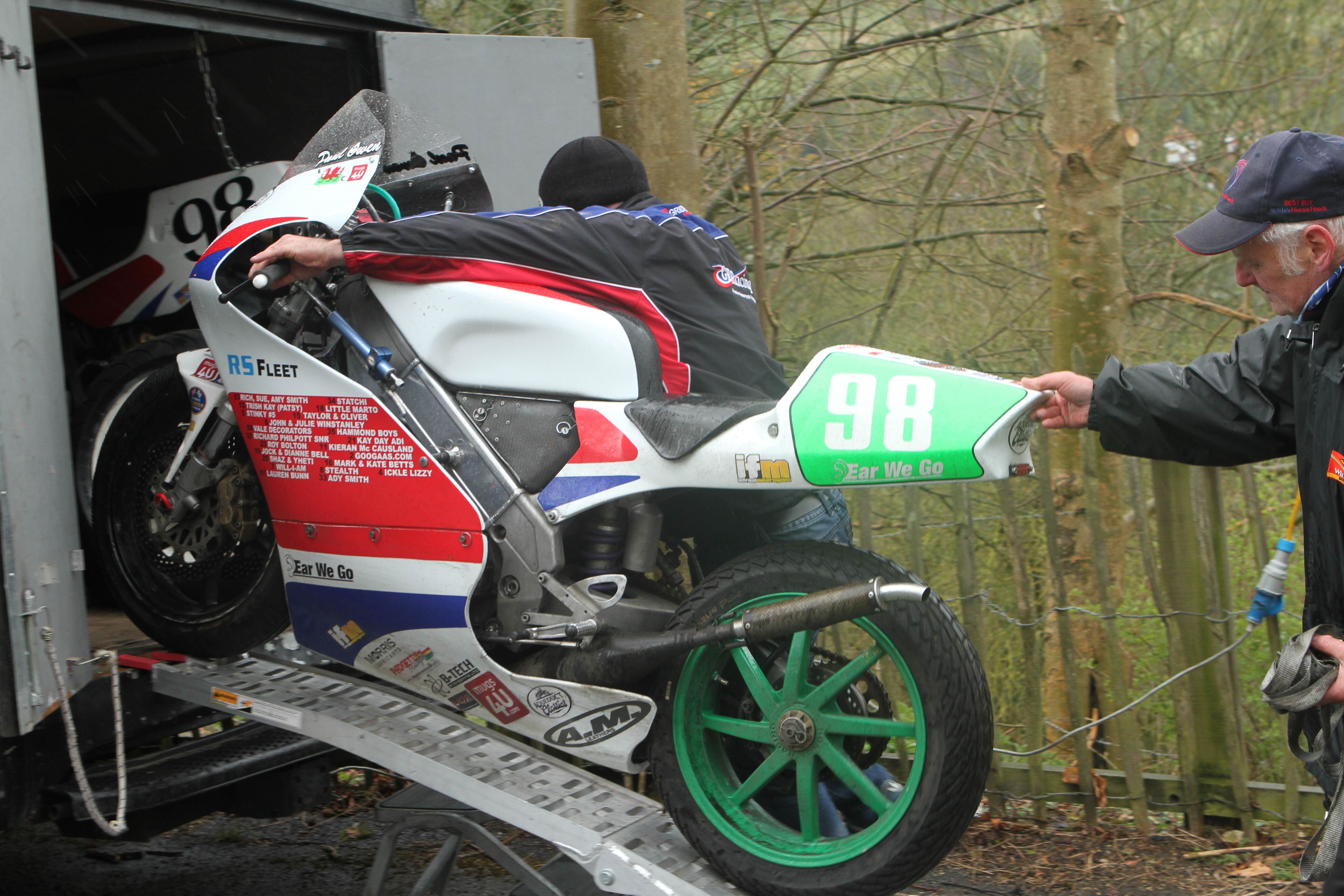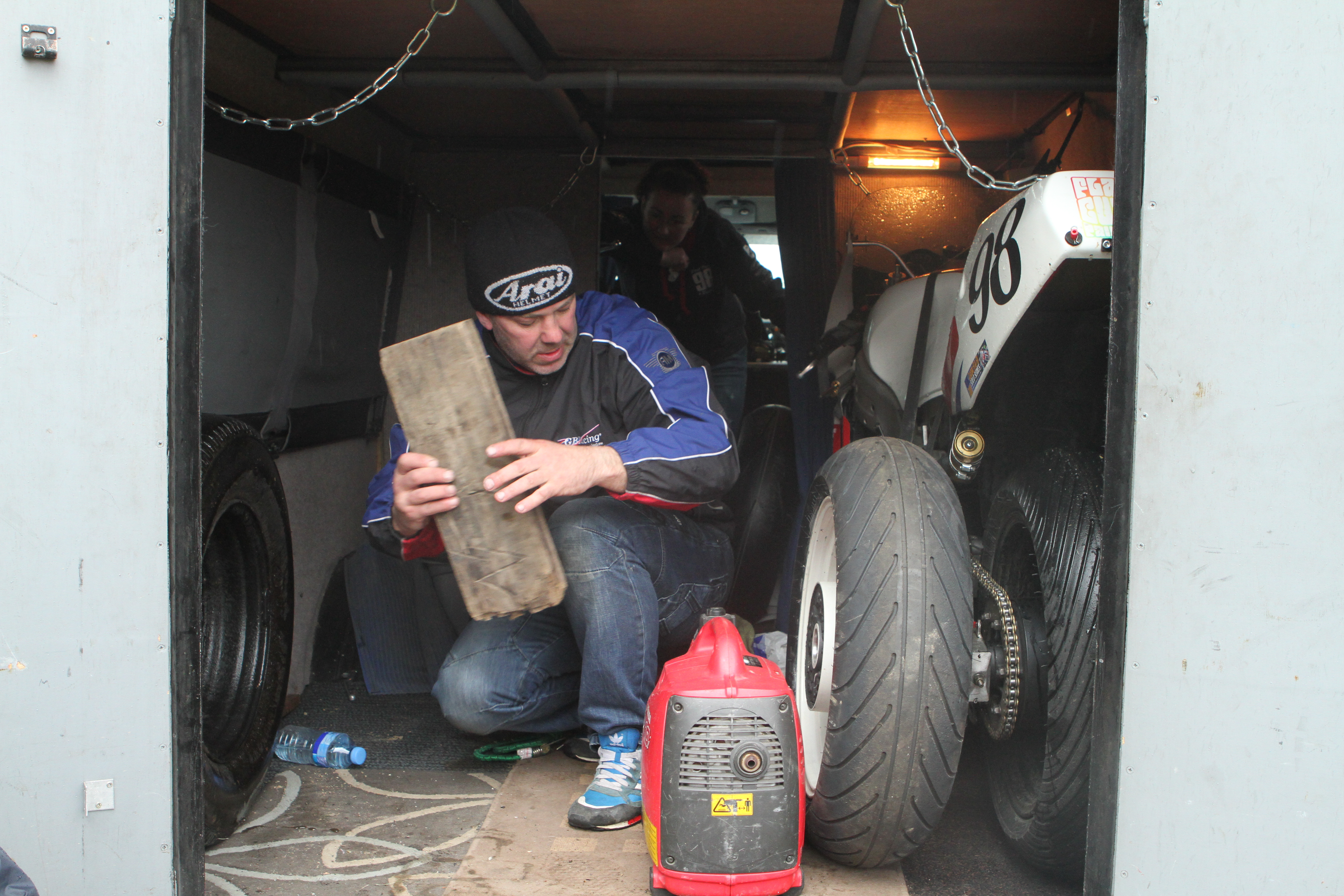 Debbie makes sure the protective clothing is ready while Paul and his Dad give one of the bikes a final check over before the practice sessions.