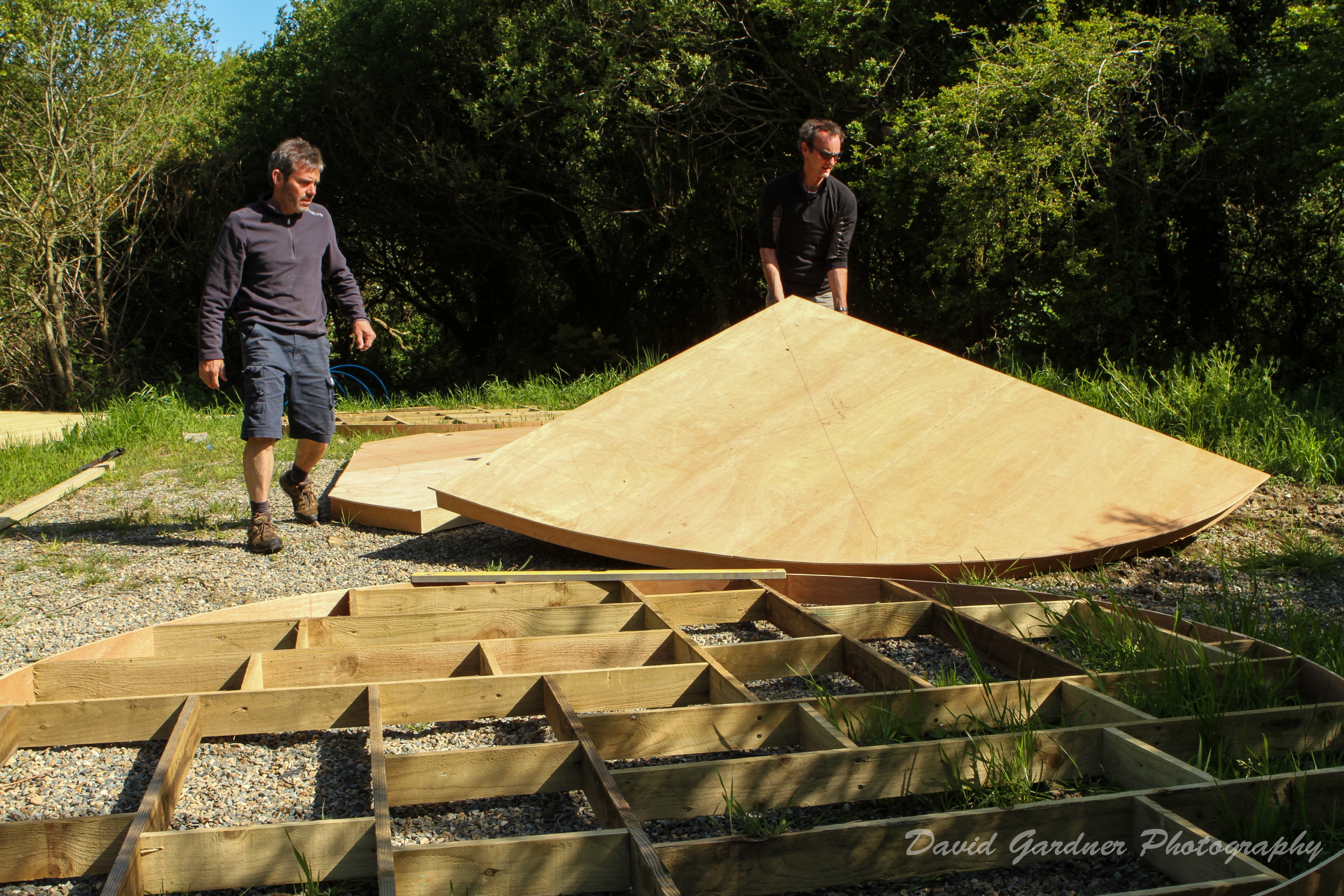 The process of laying and levelling the floors of the 3 linked structures begins. The circular lattice of planking keeps the flooring off the ground and prevents dampness and warping whilst also providing field mice and voles with dry nesting sites!