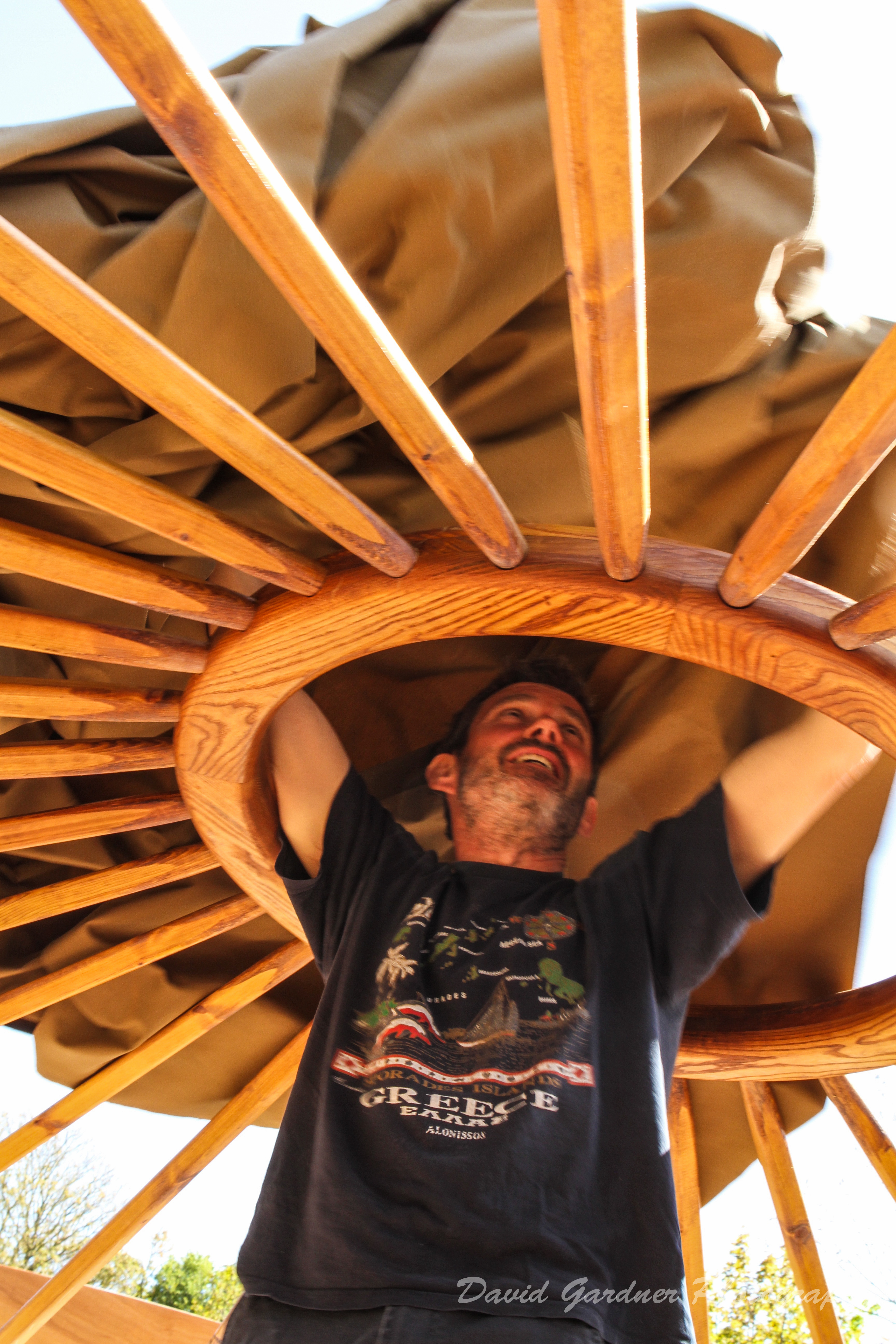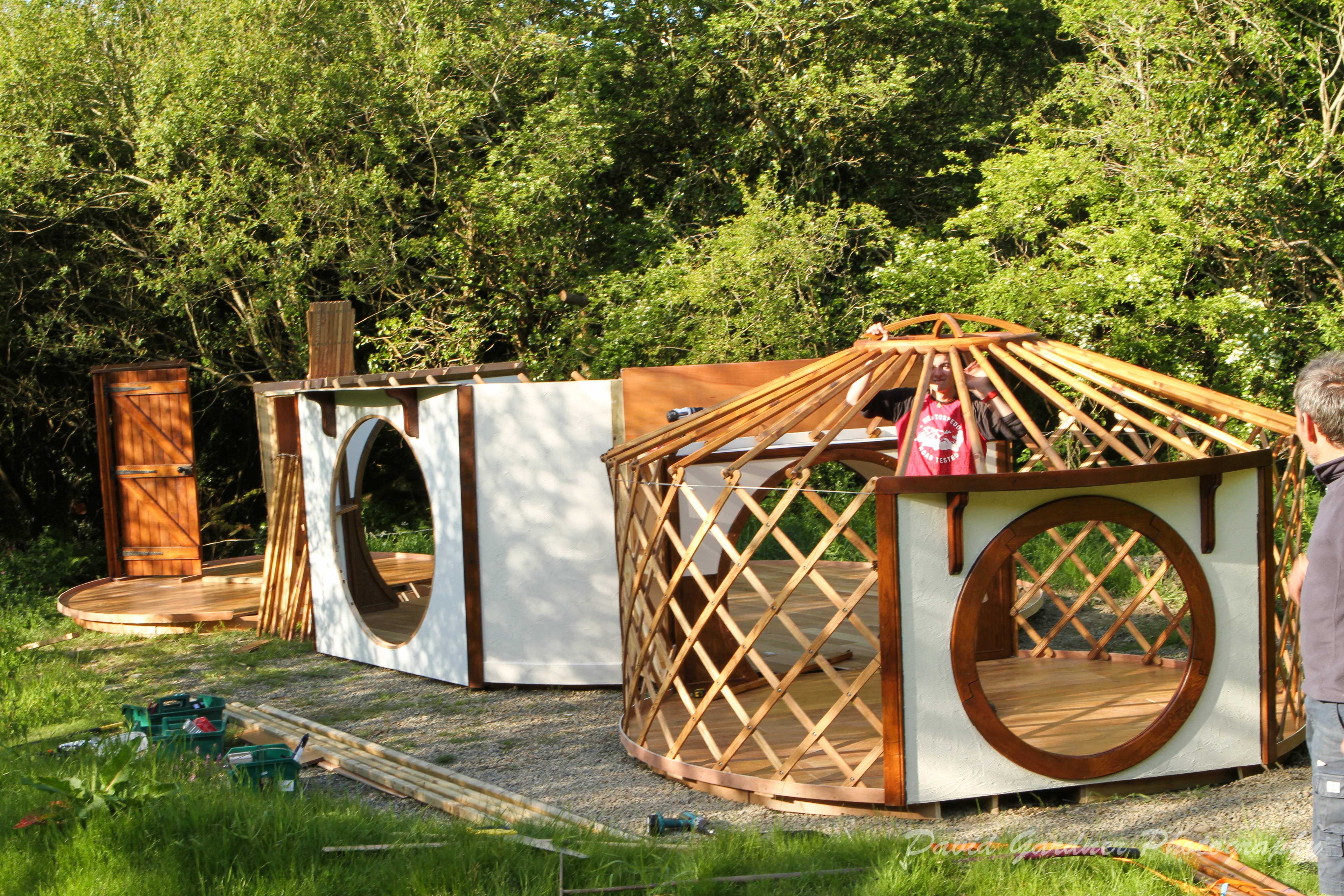 A significant moment as the roof canvas goes on over one of the smaller yurt structures. The roof is held up by the tension created between the roof poles and the wall which is held in place by a wire running right round the top.