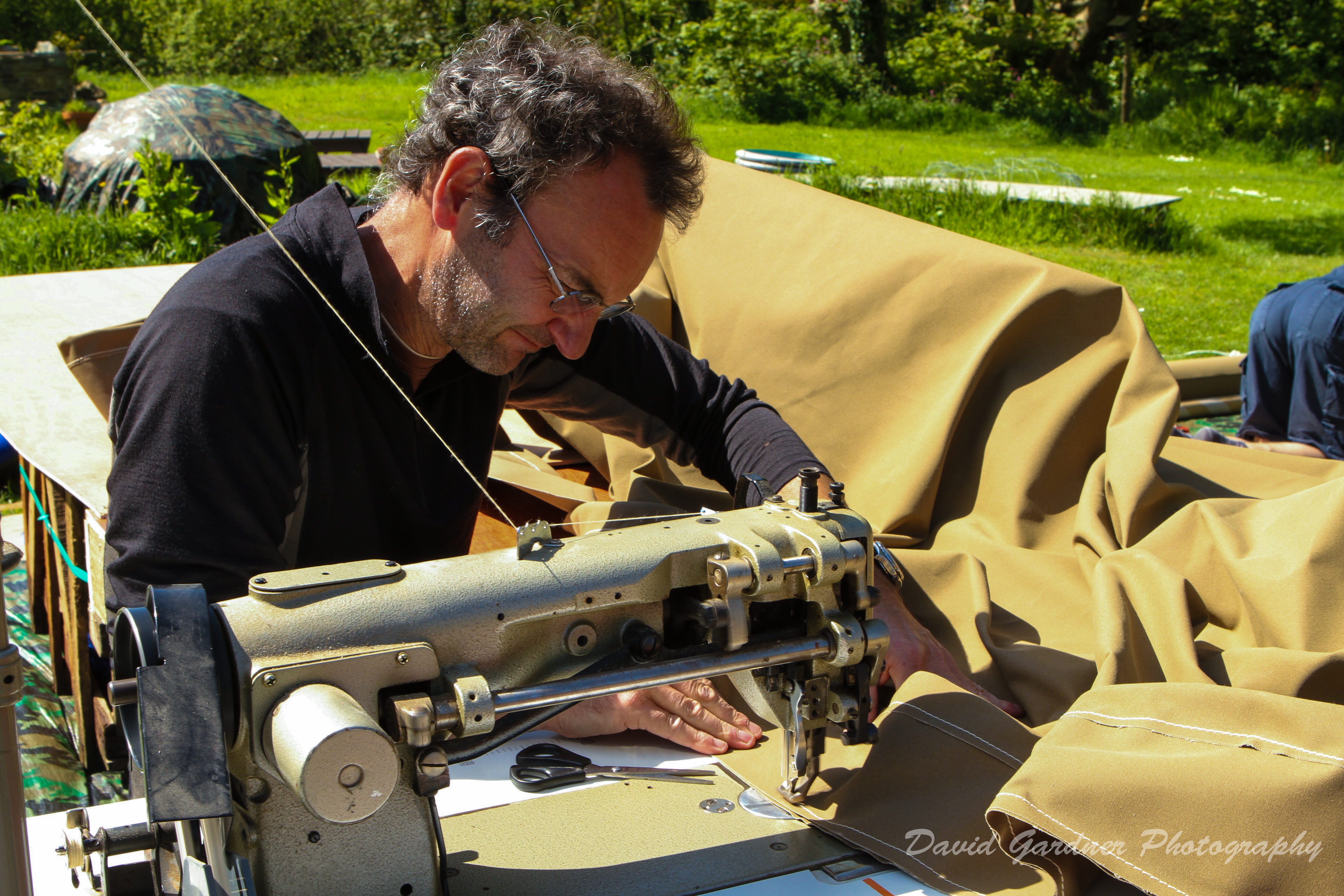 Garry, who runs his own yurt and tepee campsite, lends a hand with marking out and cutting the sheets of canvas (left) while Kevin (below) gets down to sewing the pieces together.